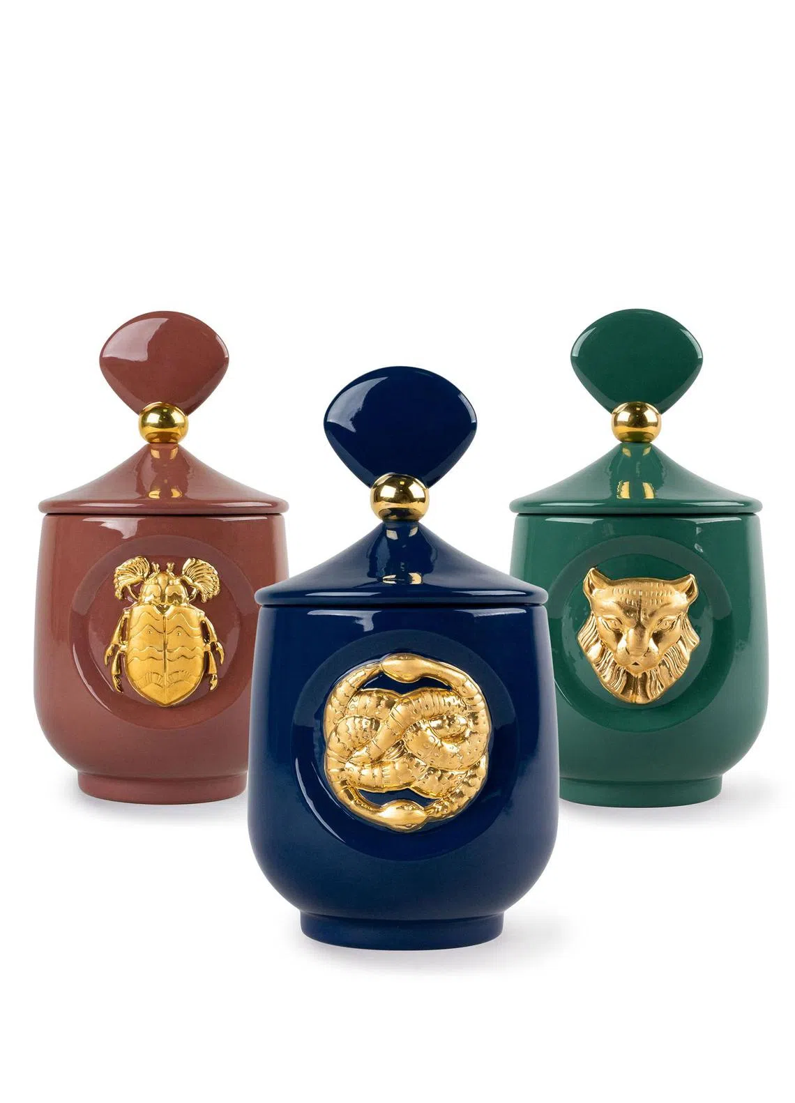 Featuring a pair of elegantly coiled serpents, an Egyptian scarab and a lynx, the motifs are etched by hand, painted in gold ink and finished with a high-gloss patina.