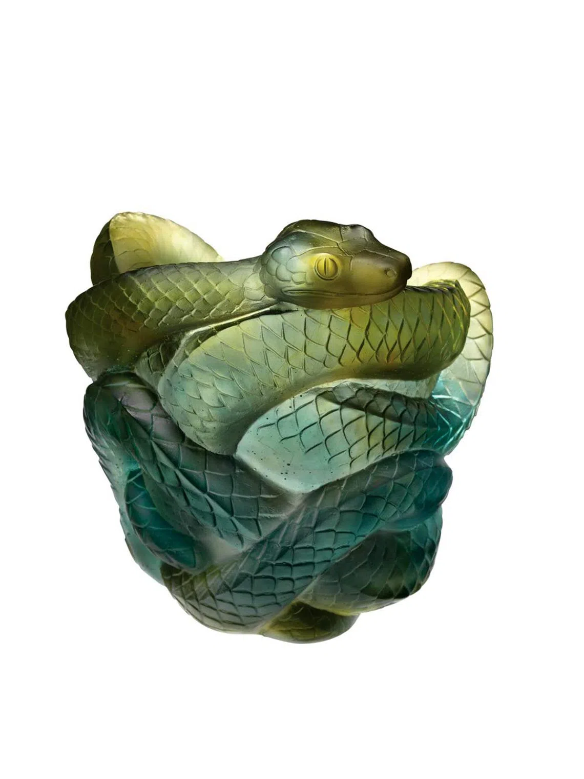 This results in a cloudy crystal translucency with many facets. Light enters the vase through the coiled snake motif and seems to be “trapped” inside, causing the vase’s green and grey hues to glow and transmit refracted light from within.
