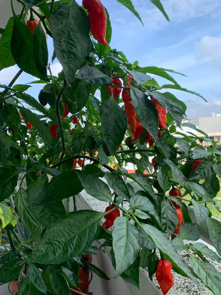 The plant is likely the Naga Morich pepper, a cultivar of Capsicum chinense. Pepper cultivars from this species tend to be very spicy.