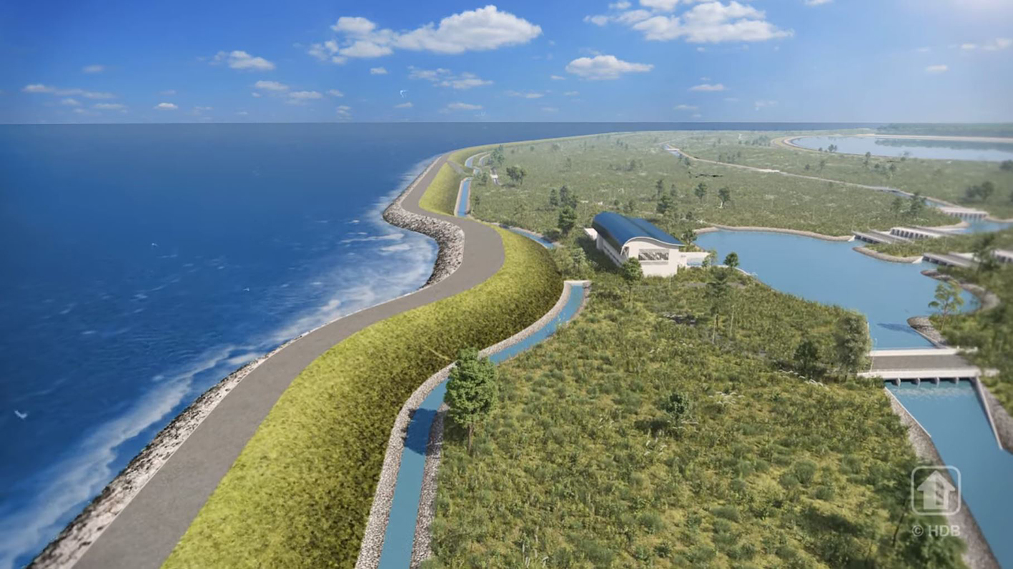 The raised polder dike conceals a network of drainage systems that keeps the inland area dry.