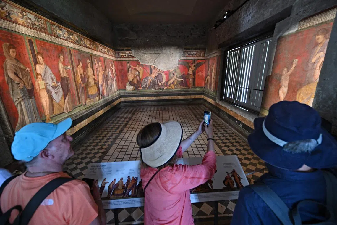 Tourists visit the Hall of Mysteries in the Villa of the Mysteries, lit by green energy.