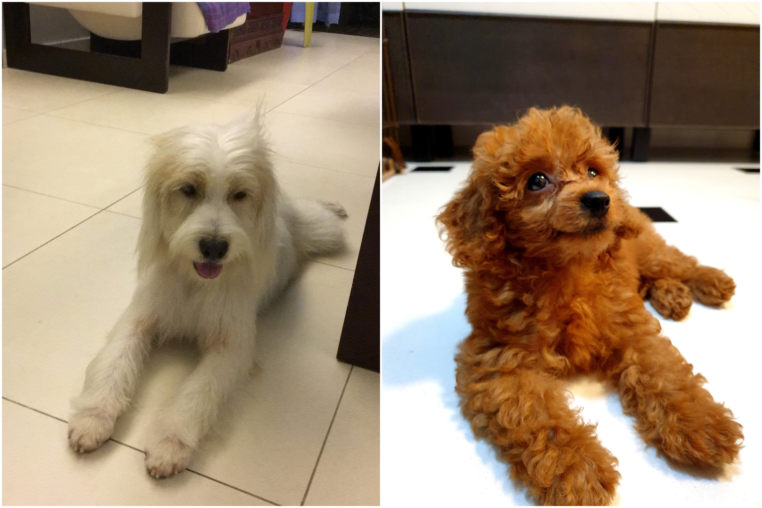 Patches, the beagle-shih tzu mixed breed (left), and a poodle puppy named Lady.