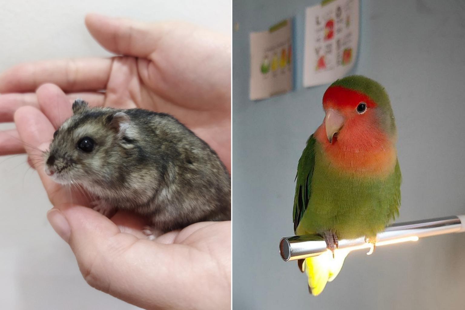 Male hamster named Dumbledore (left) which has clear and yellowish-greenish urine and an adopted lovebird which bites.