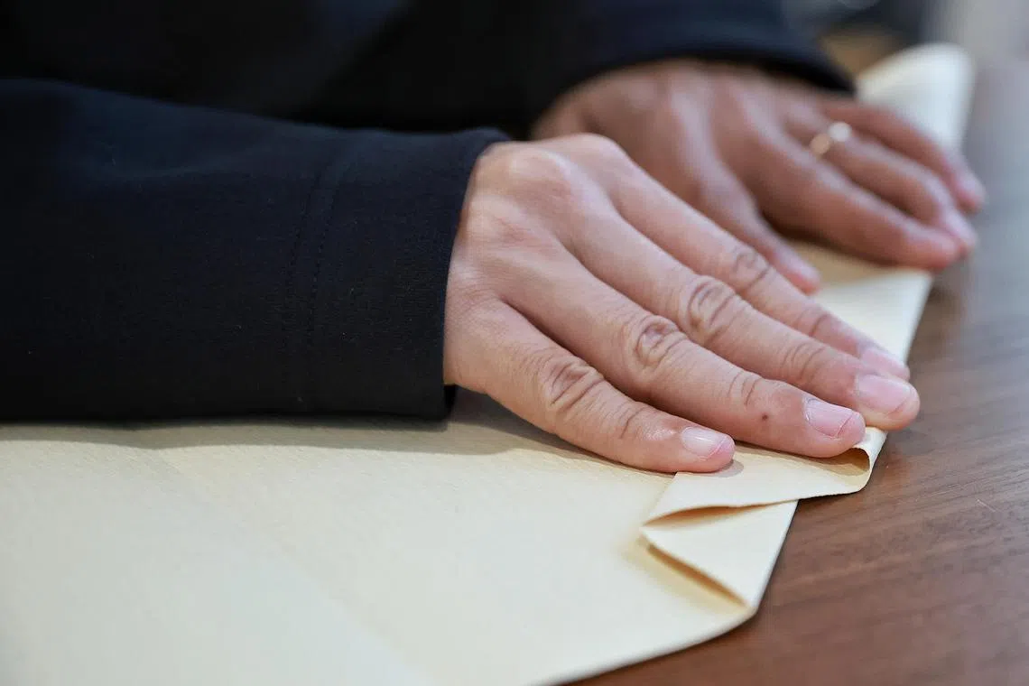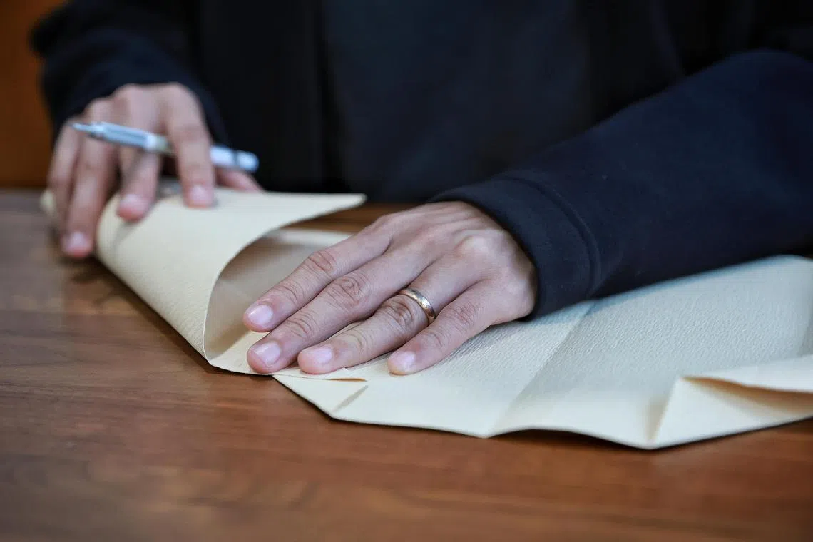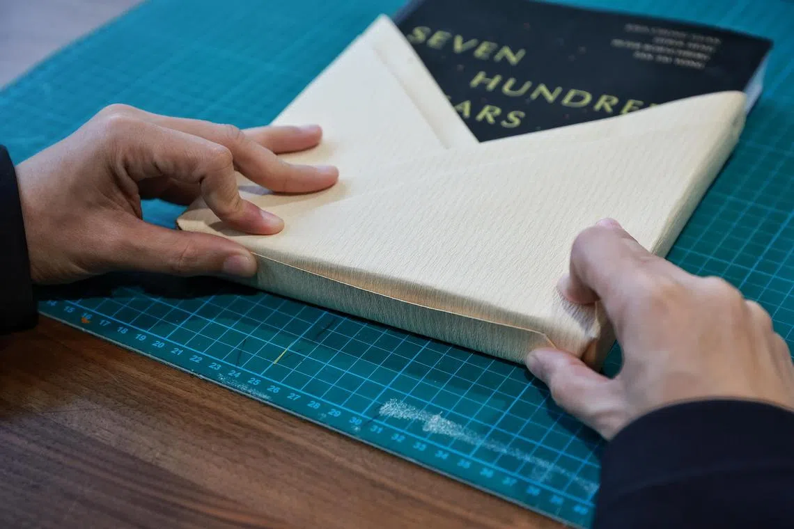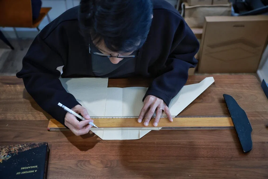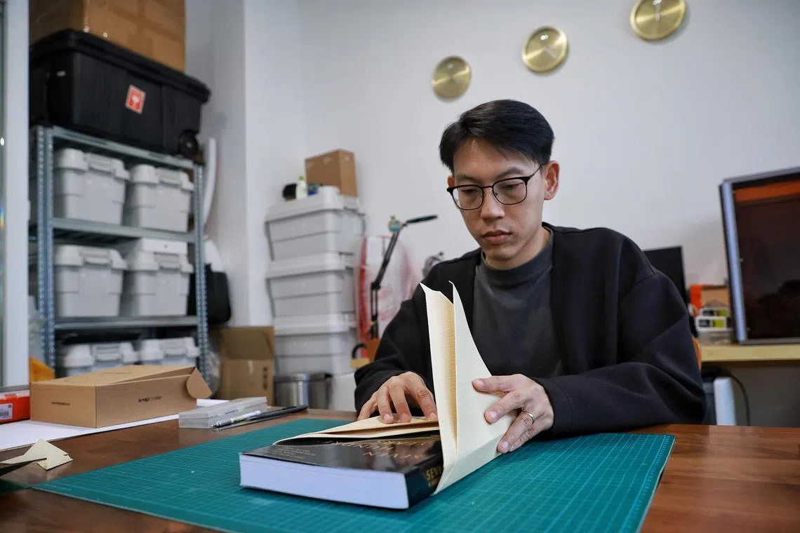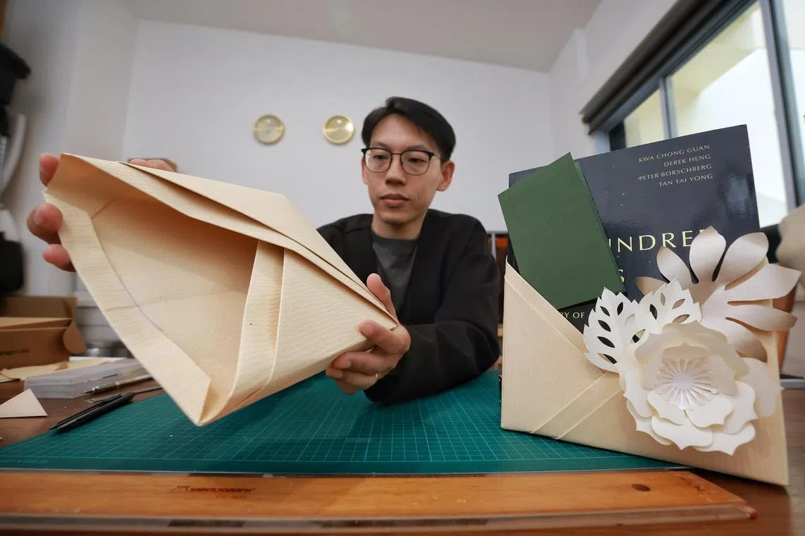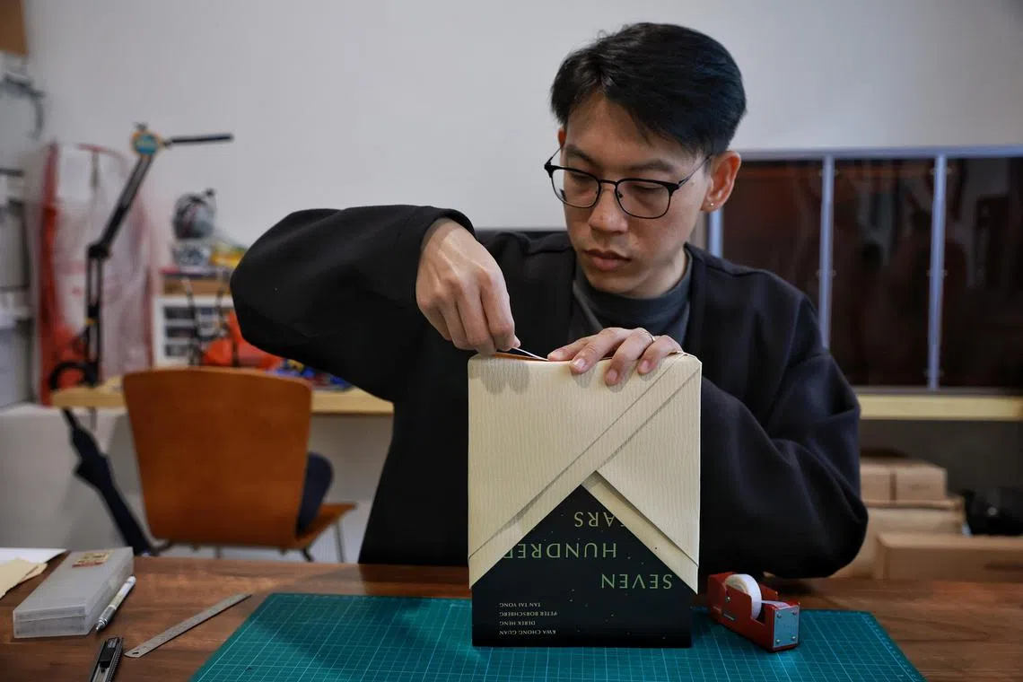 Mr Melvin Ong, 38-year-old product designer and founder of design studio Desinere, using the pleating technique (sequence 8/9) to create a simple sleeve for a book on Dec 20, 2022.
