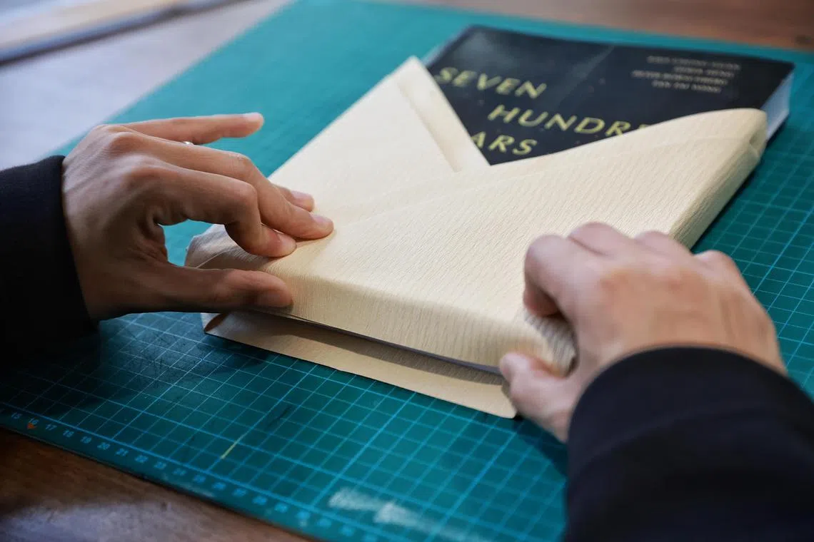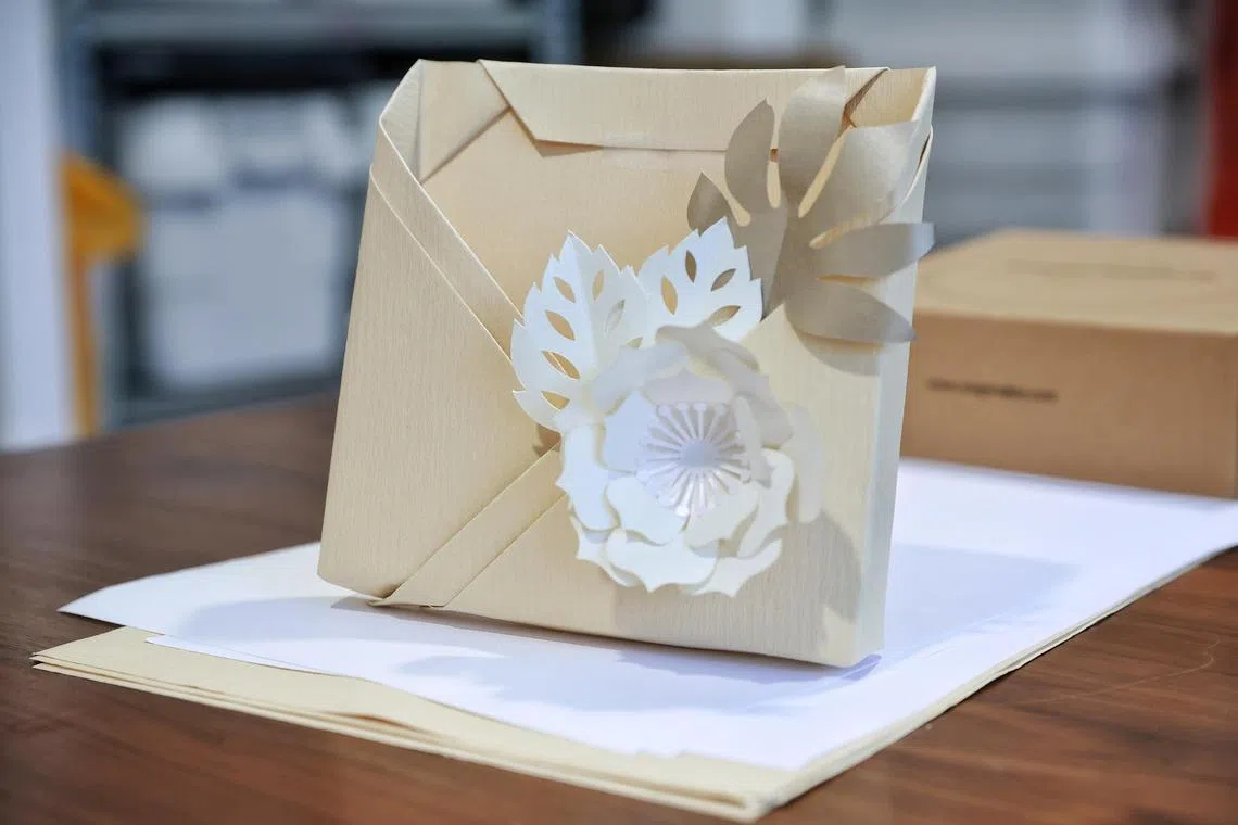 The founder of home-grown design studio Desinere says that with a little cutting, folding and pleating, even ordinary A3-size printing paper or textured paper can be crafted into a standout sleeve to hold a book gift.