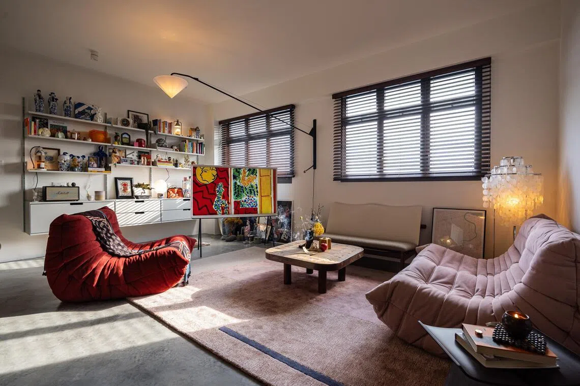 A yellow modular storage system from Swiss design brand USM takes pride of place in their study. A burgundy Ligne Roset Togo lounge chair anchors the living room, complemented by a larger, matching piece in dusty pink.