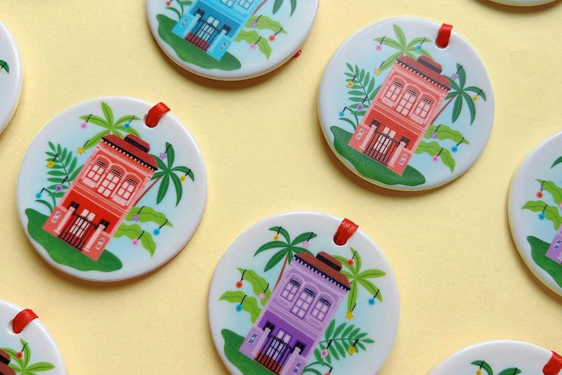 Home-grown studio EM + Co Art sells a set of four Christmas ornaments that feature Peranakan shophouse facades in teal, lilac, hot pink and coral surrounded by tropical plants, which also make great souvenirs.