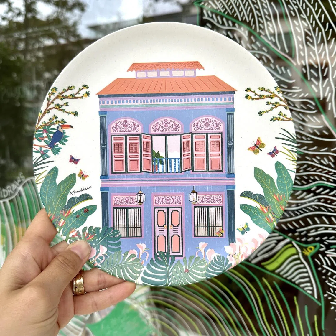 Ms Yeni Lim's plates feature digitally hand-drawn images of shophouses, old housing estates and black-and-white colonial-era bungalows.