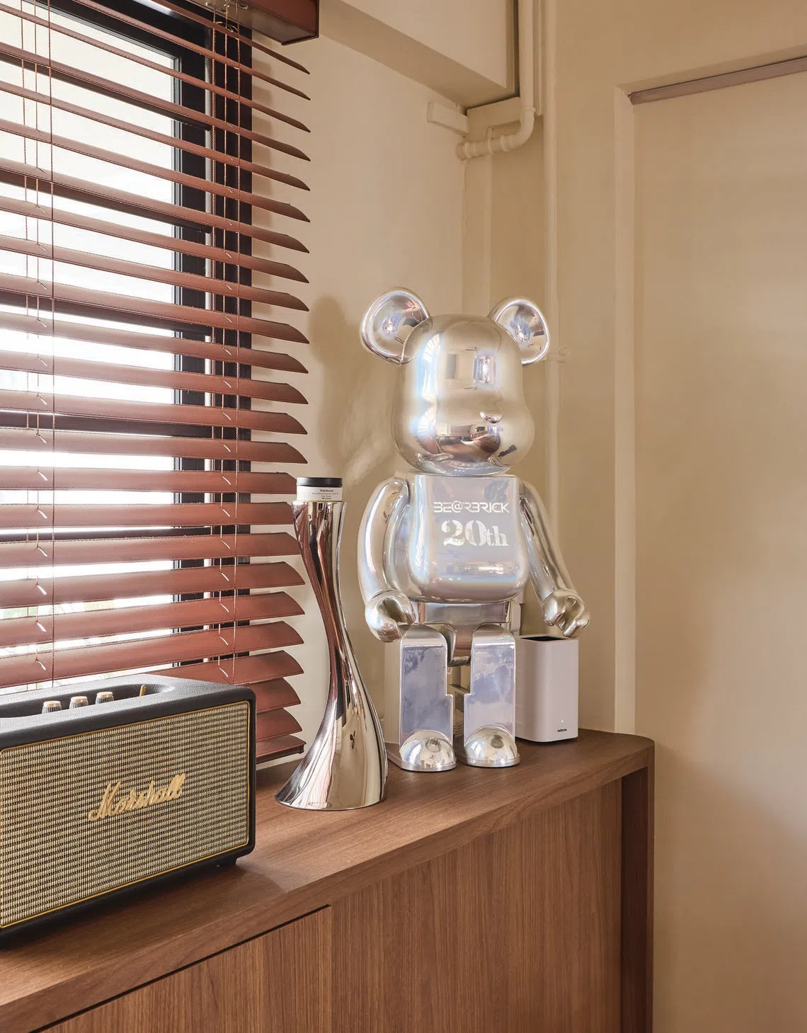 Metallic accents, like the Bearbrick figure and sculptural lighting, contrast against the warm wood and leather.
