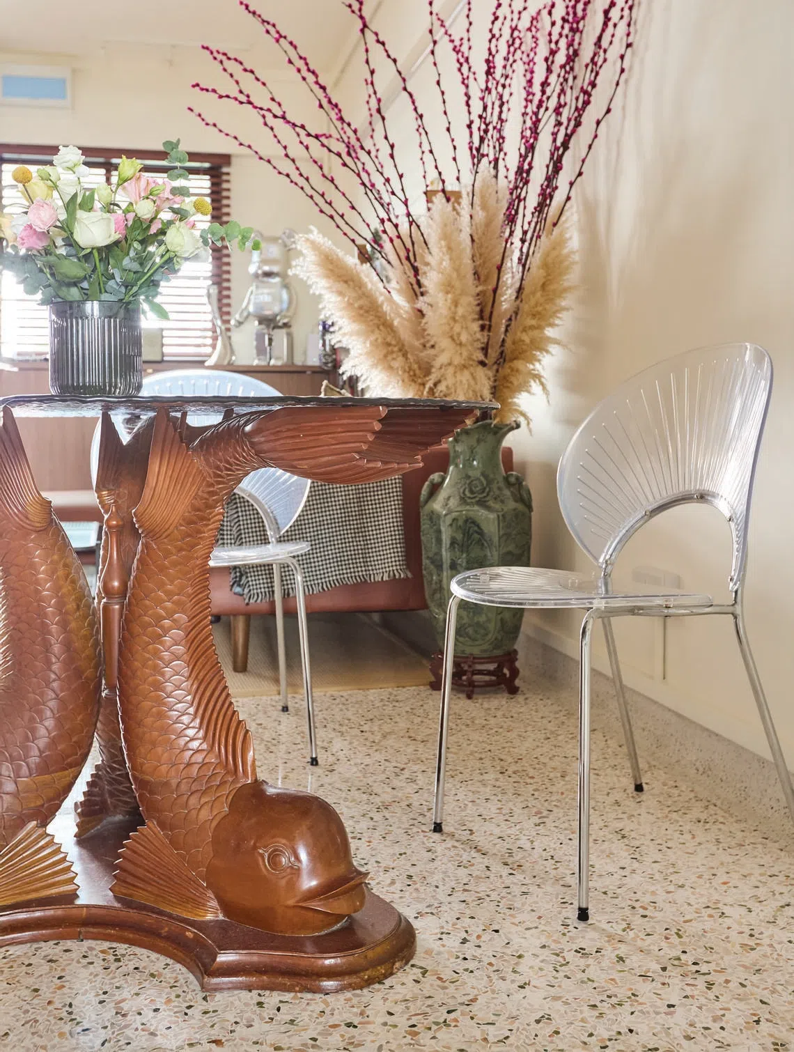 Another striking piece is the glass-topped dining table with legs shaped like fish, a combination of items bought on e-commerce platforms. “I got the fish legs from Carousell and the glass top from Taobao,” he says. “Not everything needs to be new – there’s some charm in vintage items.”
