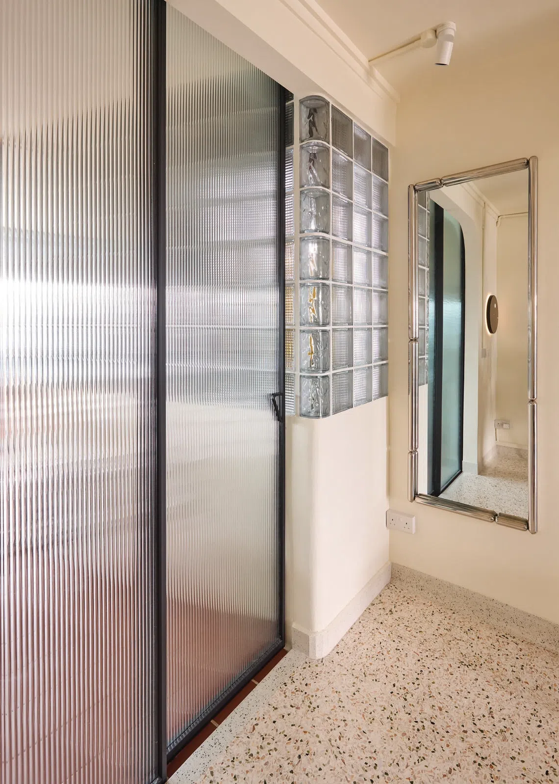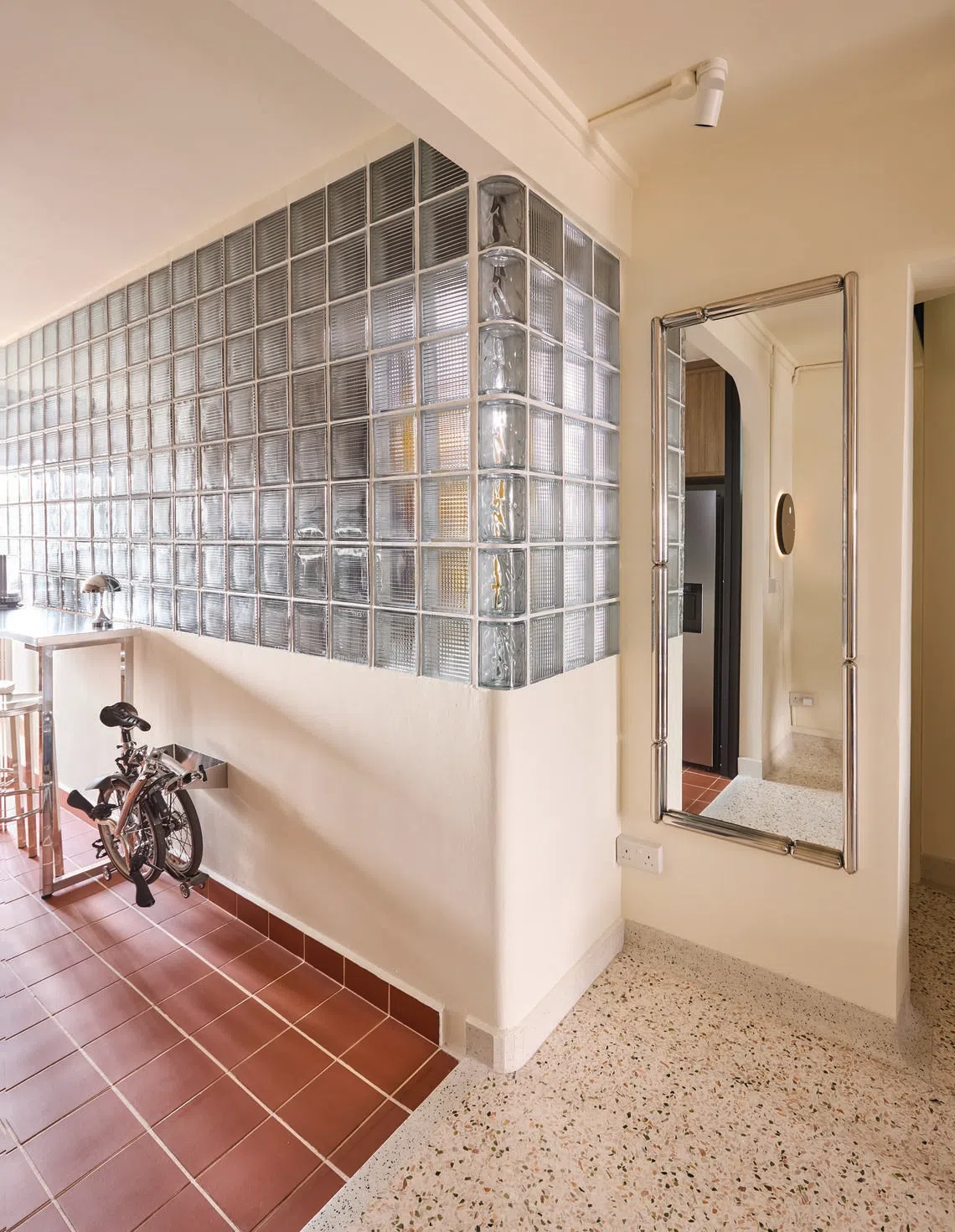 The glass brick wall lets light into the flat while maintaining privacy.
