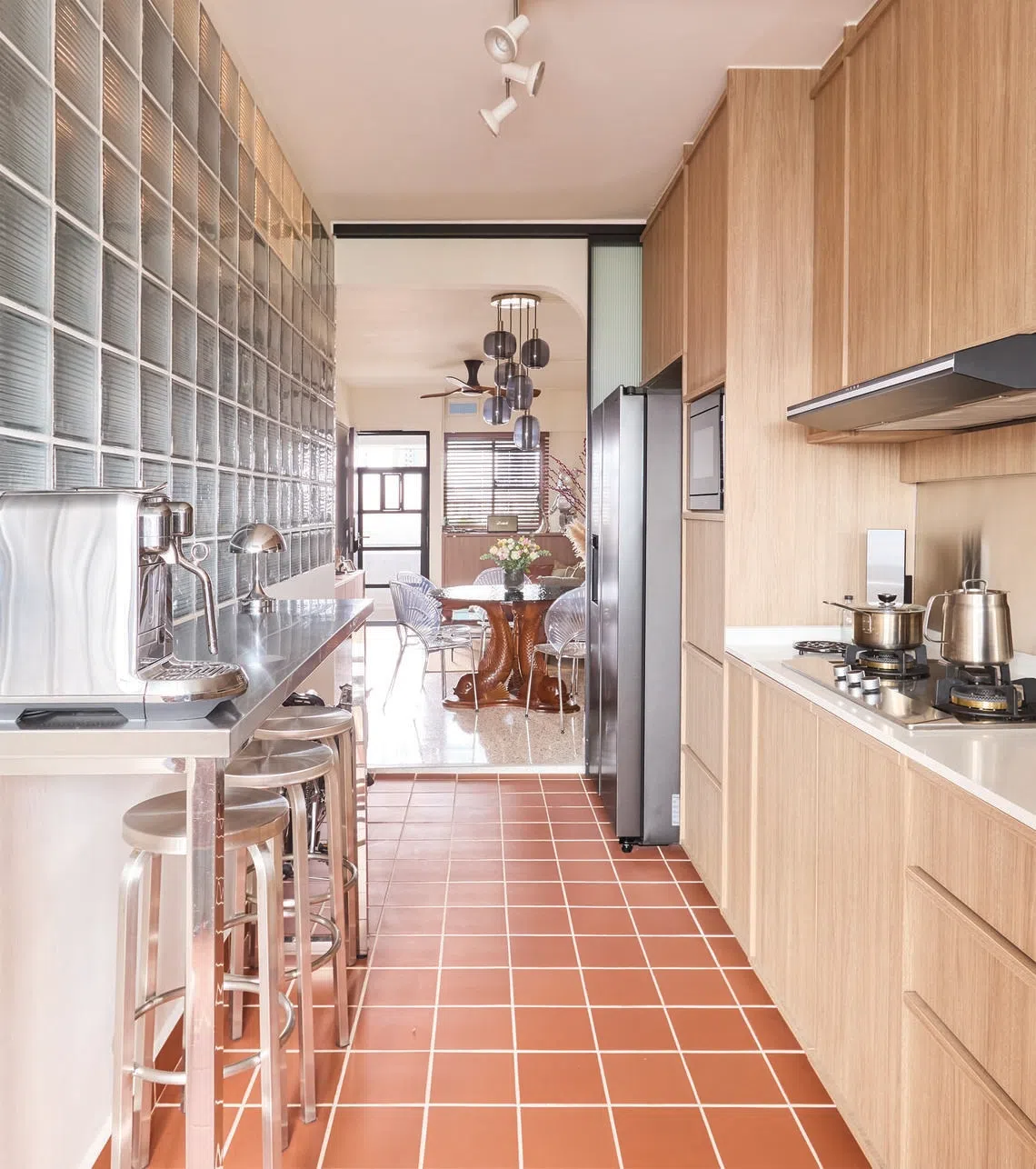 Mr Lui spent months researching his vision before engaging designer Dennis Lim of home-grown firm Reznos Design to bring it to life. Together, they built the flat’s centrepiece: an old-school glass-brick wall that separates the kitchen, wardrobe and bathroom.