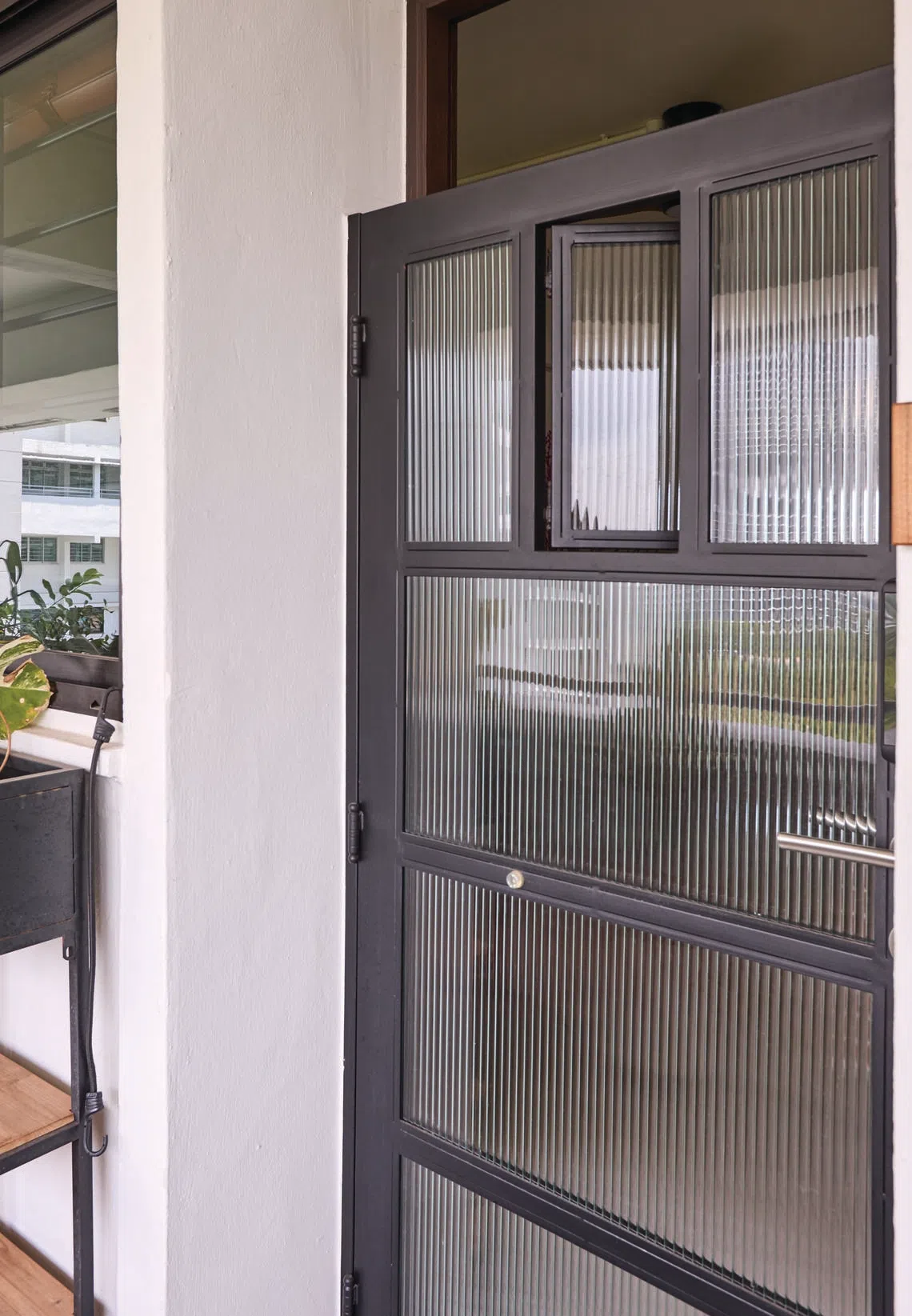 Another well-considered touch is the custom-made fluted-glass metal gate at the entrance, which acts as a privacy screen but has a small hatch for deliveries – a thoughtful detail that balances form and function.