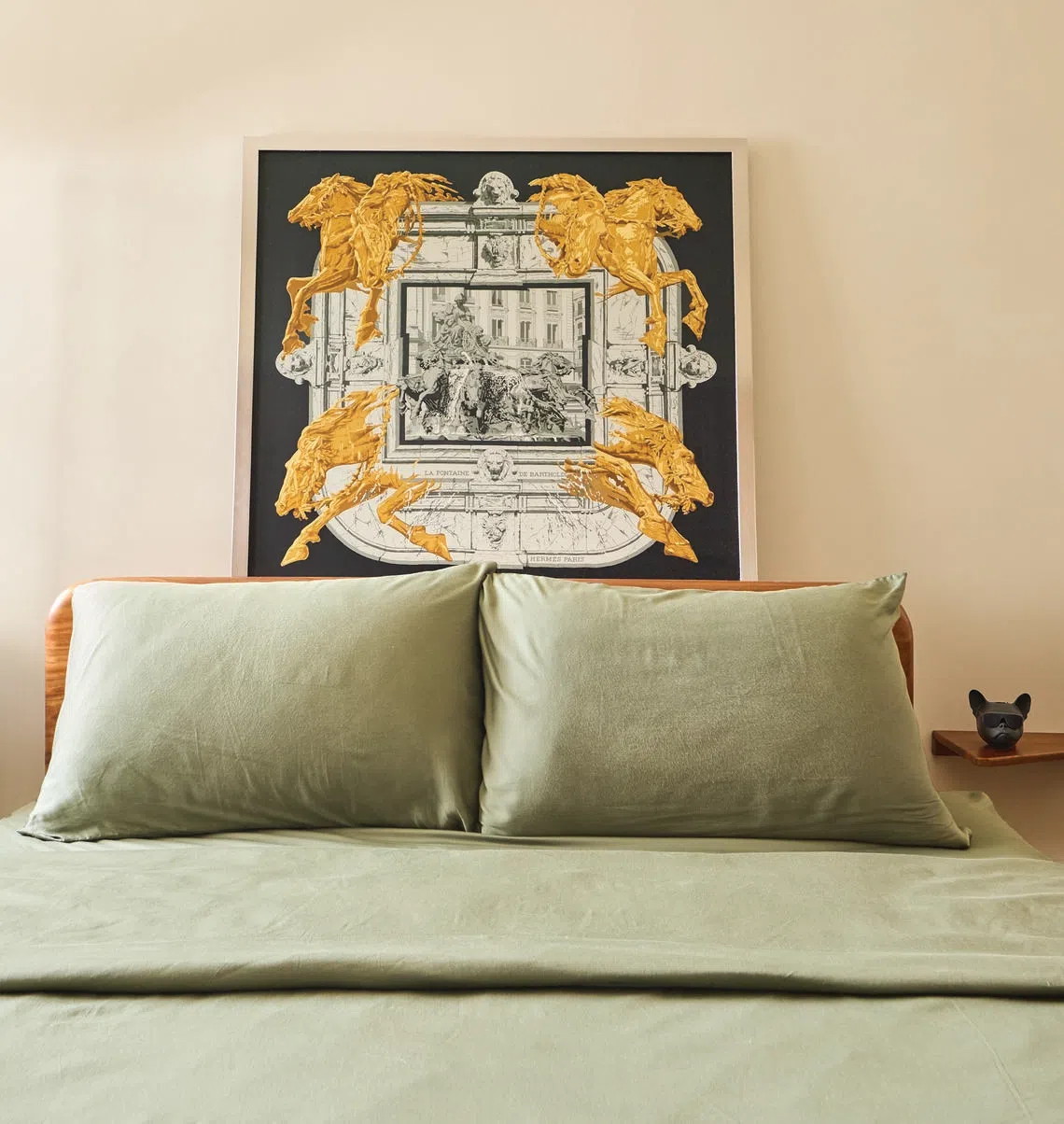 The Hermes scarf above the bed acts as an elegant focal point.