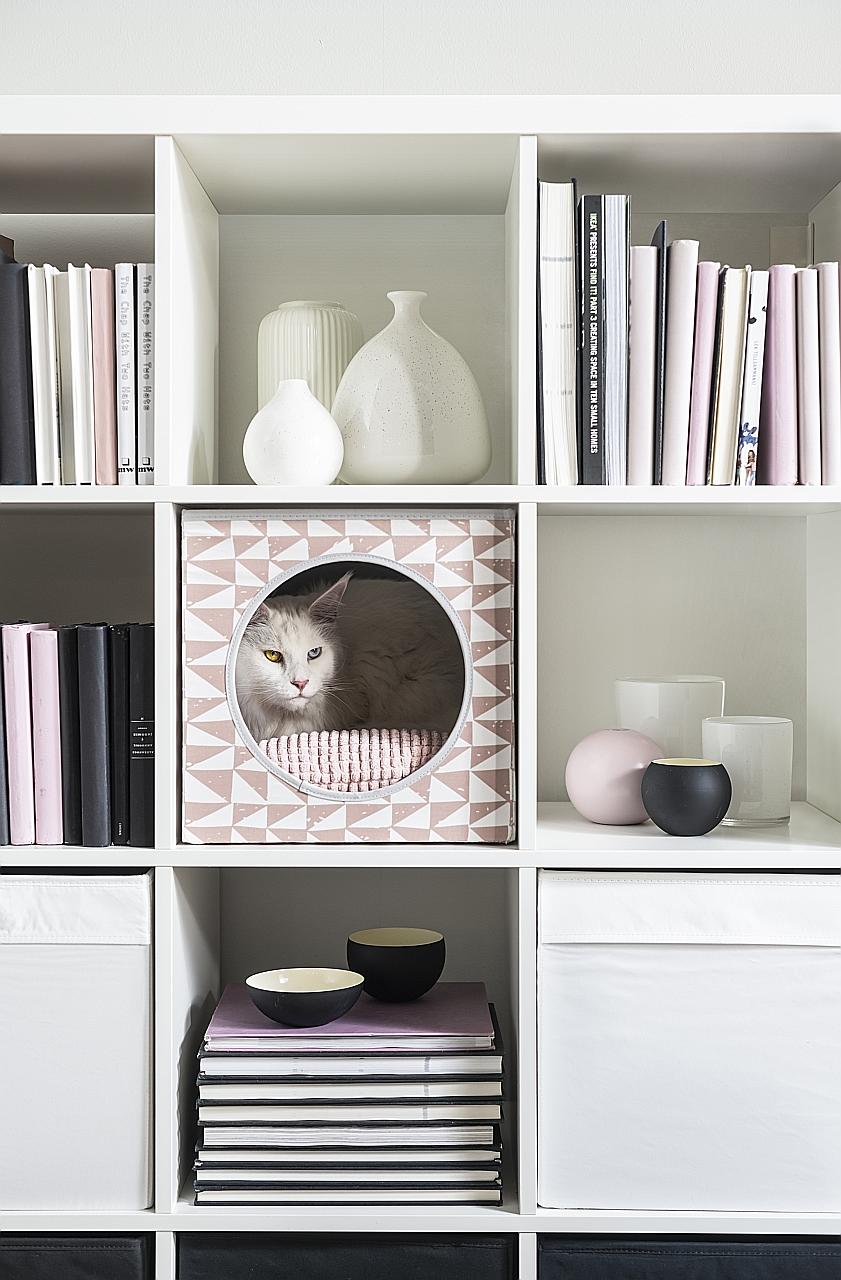 The cat house, for instance, goes perfectly with Ikea classics such as the Kallax shelving unit.