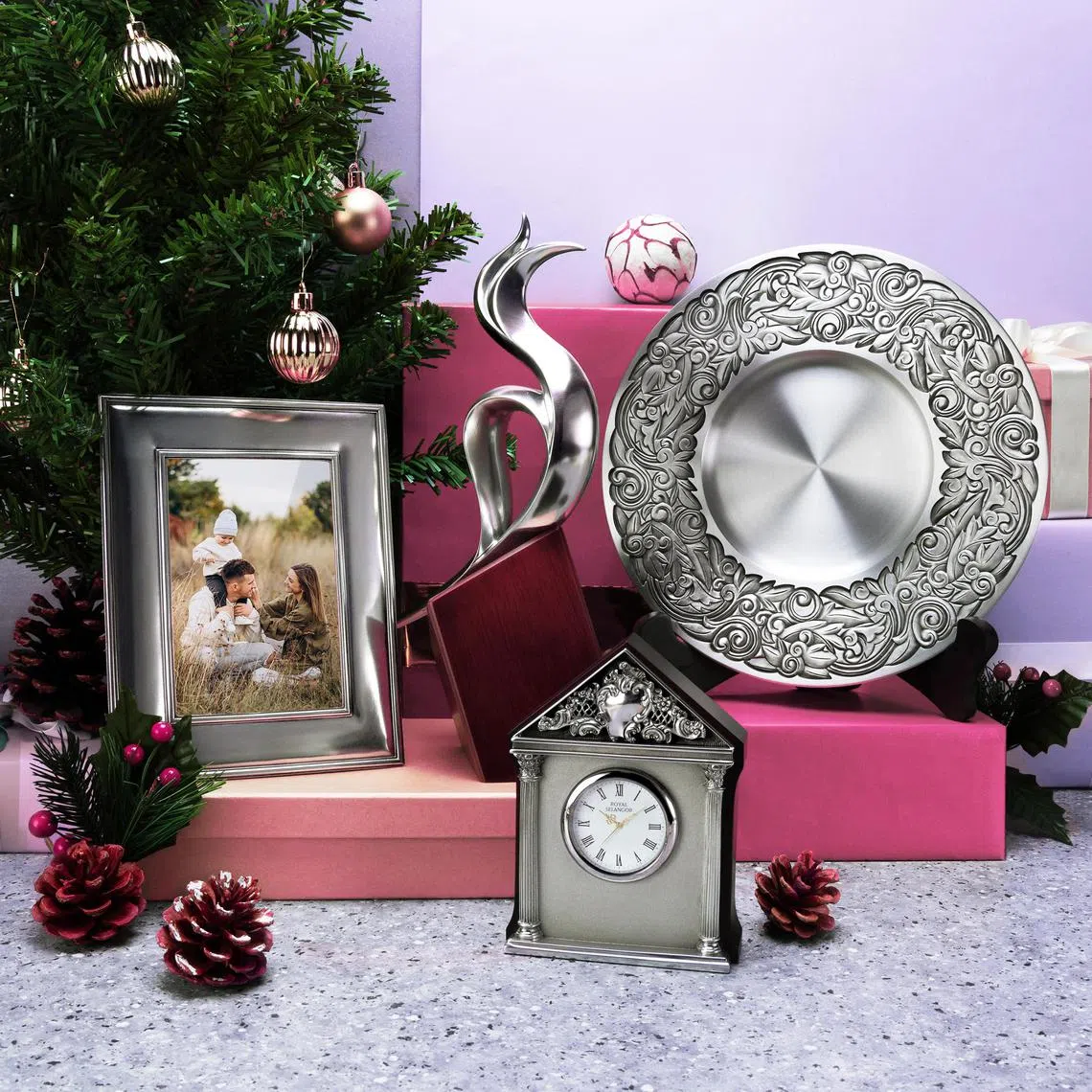 English Photoframe, Sculptura Hornbill, Corinthian Table Clock and Isthmus Plate from Royal Selangor.