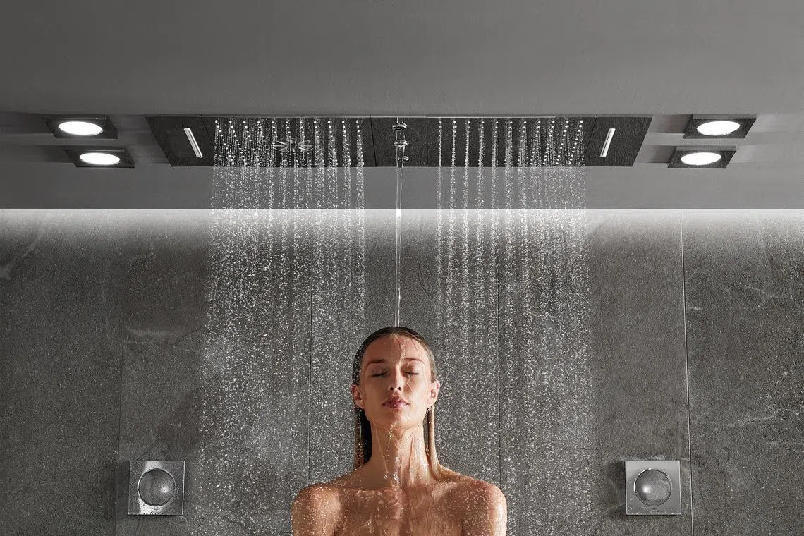 Grohe Spa Rainshower Aqua Ceiling Shower is a modular shower unit with different spray patterns that can be combined for a soothing, restorative effect.