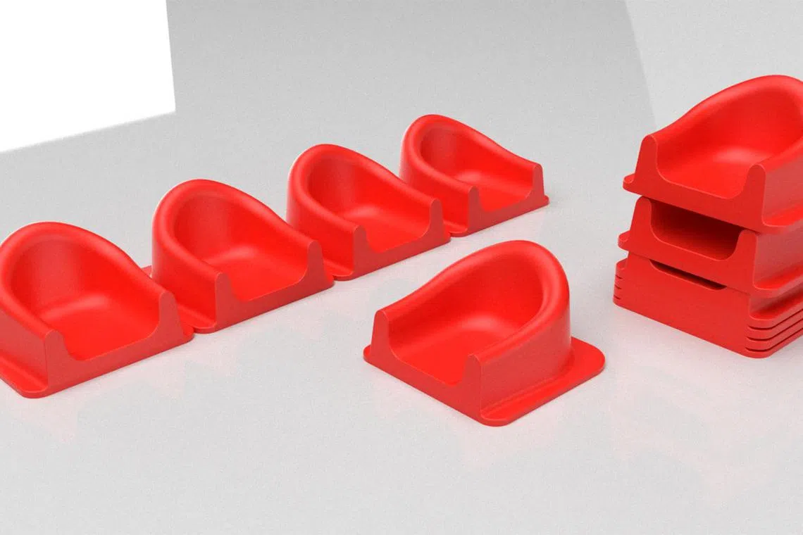 The design features a rounded, ergonomic seat with no sharp corners. It is made of acrylonitrile butadiene styrene or ABS, a plastic ideal for injection moulding as it has high heat resistance. Underneath each seat are collapsible ribs designed for absorbing impact.