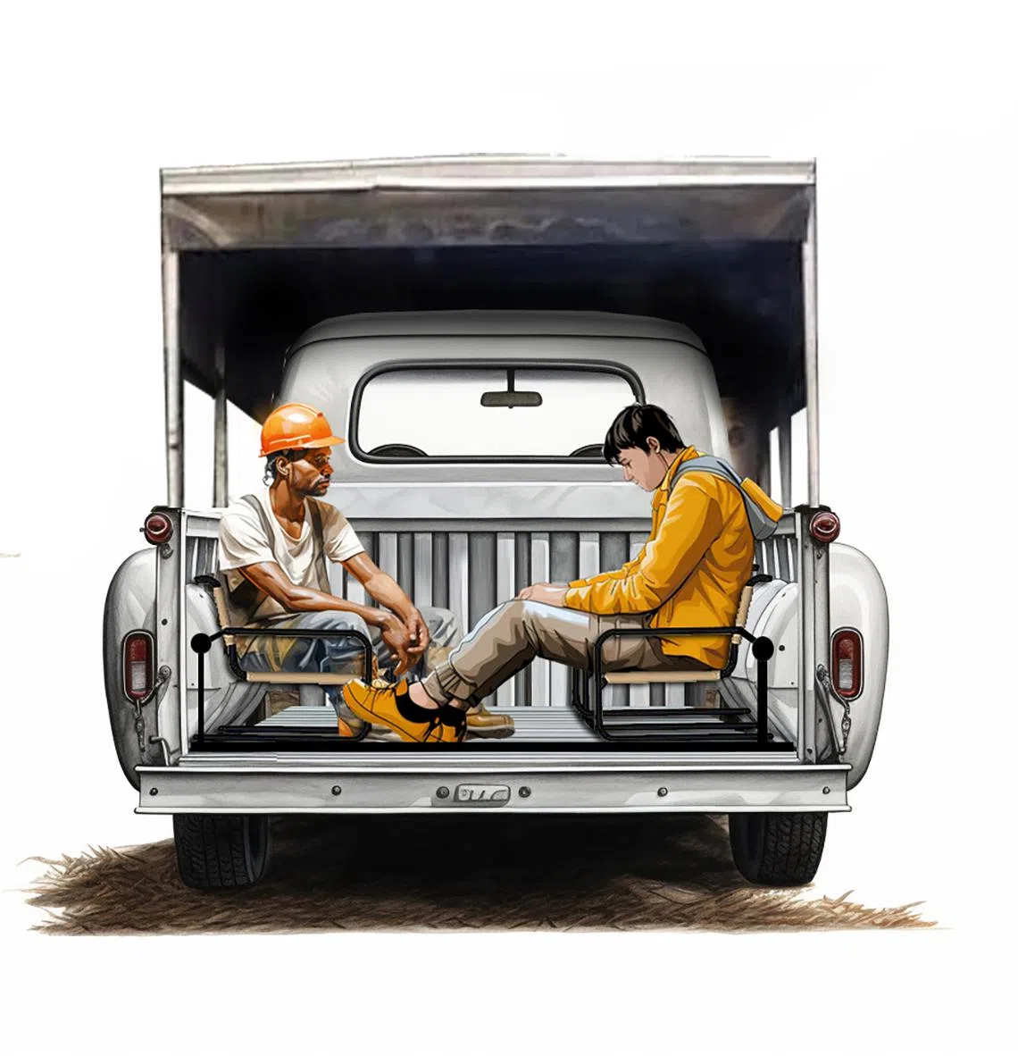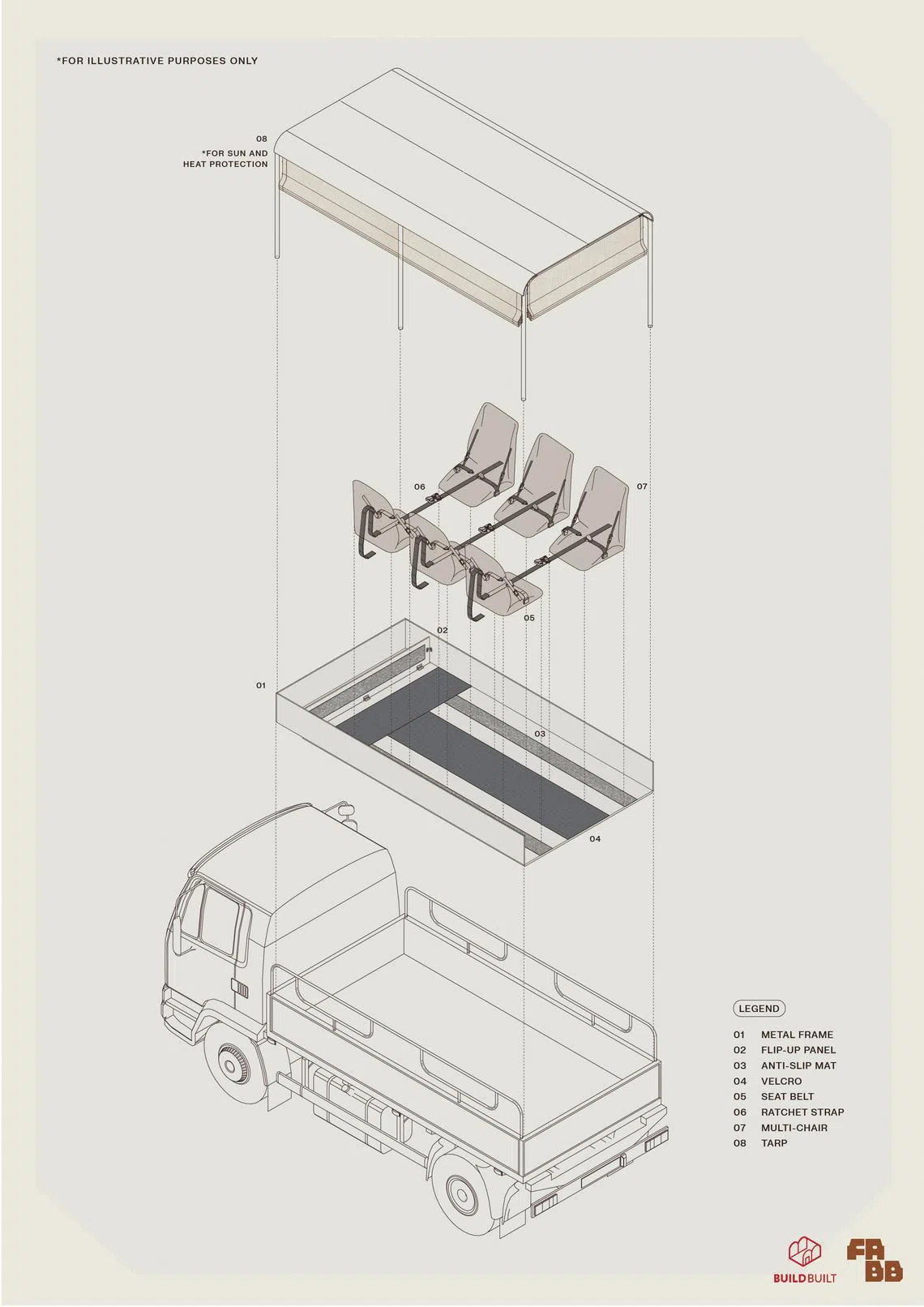 His design for seating atop a lorry’s flatbed area is an ergonomic structure that provides spinal support during long journeys from the dormitory to the workplace and back.