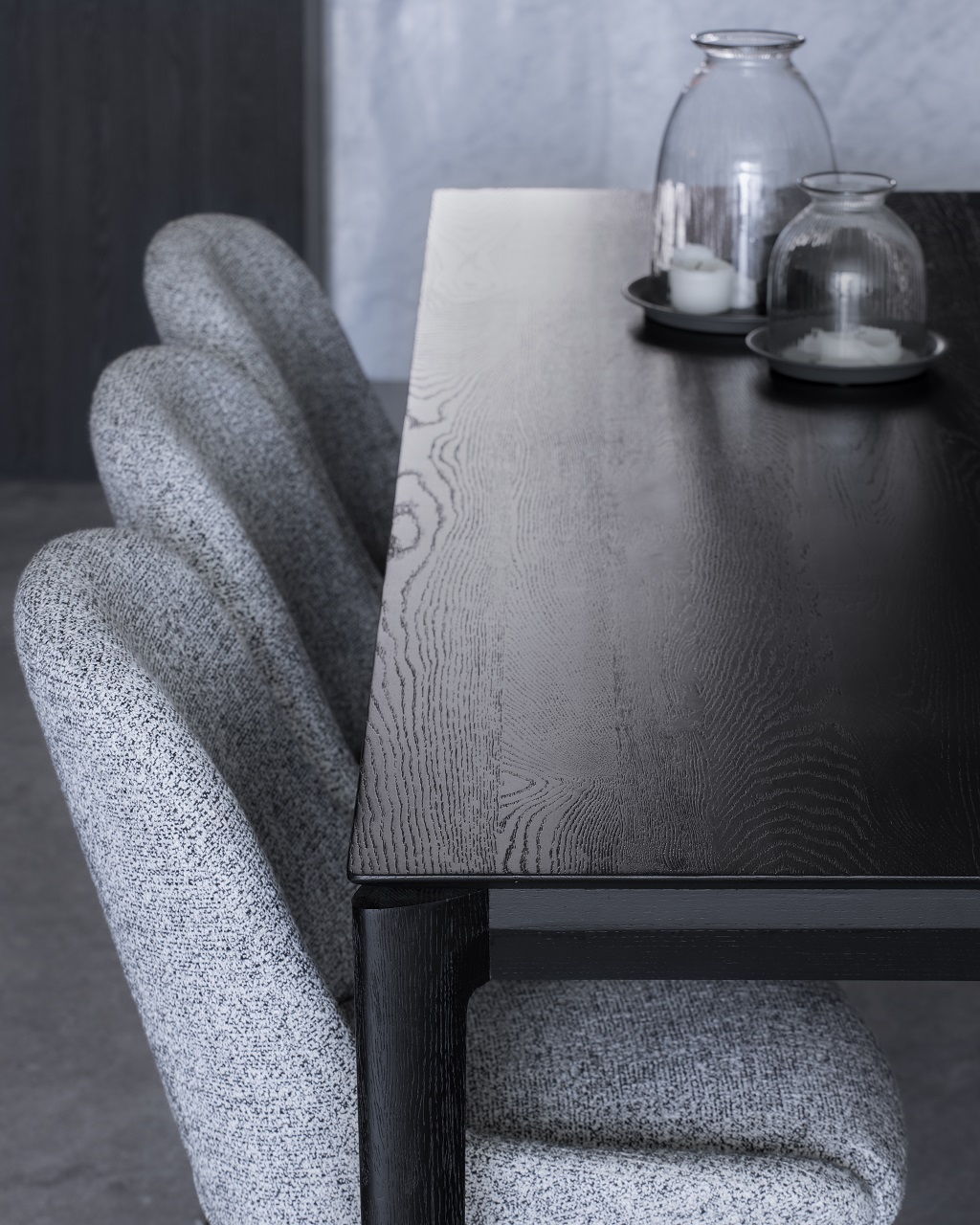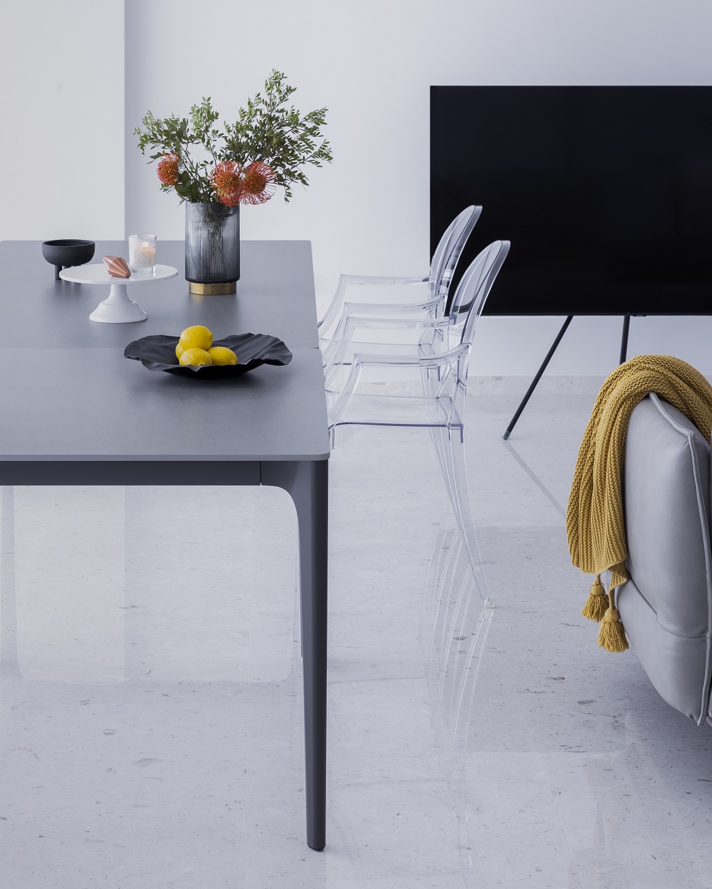 To find furniture pieces that complemented her sofa, Valerie returned to King Living. For the dining area, she picked out the Quay Indoor Dining Table in an onyx-finish timber and complementary Quay Indoor Armless Dining Chairs in a textured grey fabric. For the bedroom, she chose the Neo Bed with hardwood legs.