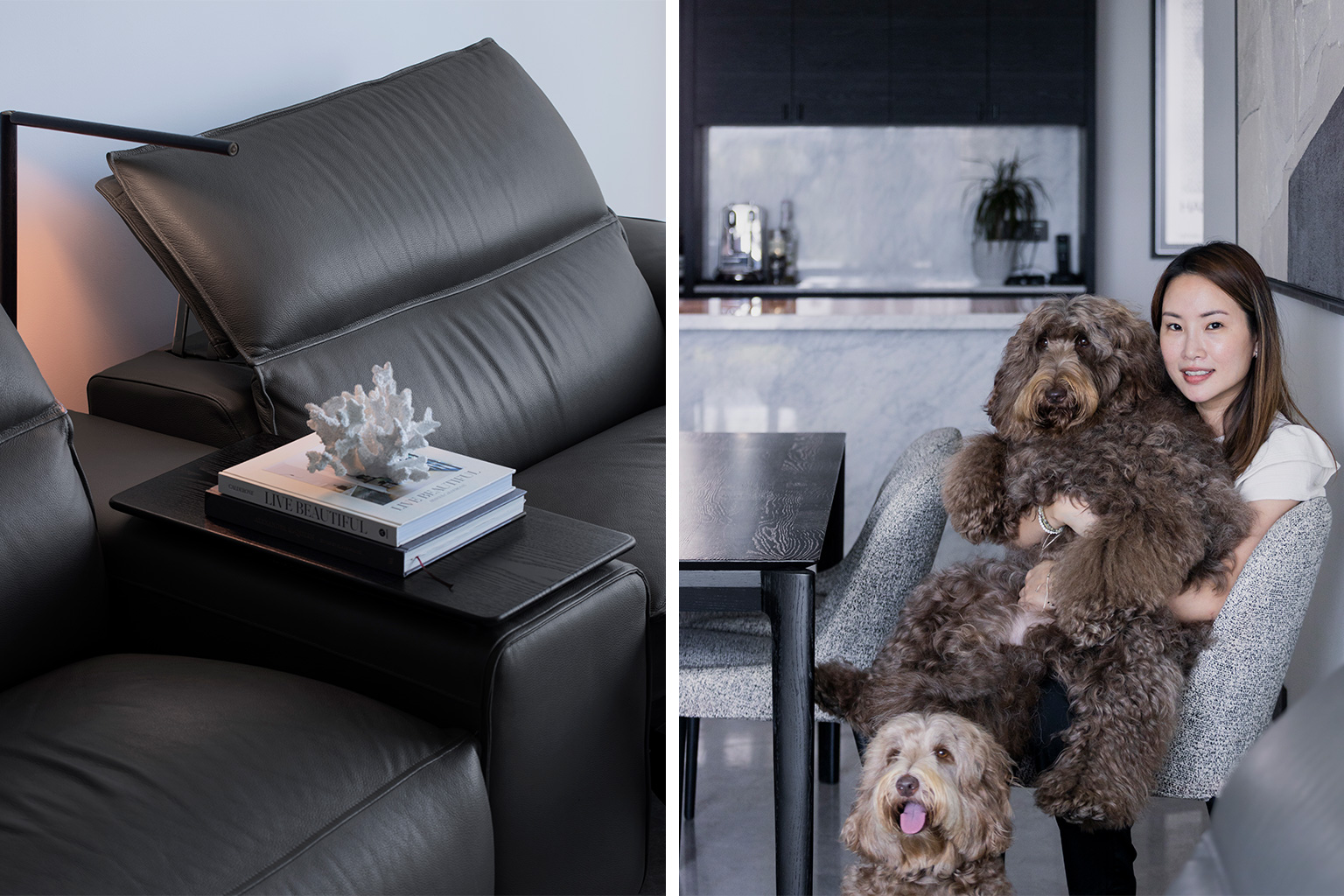 The luxurious King Living recliner King Cloud V (left) is the centrepiece of Ms Valerie Sim’s family's living room, which they share with two adorable labradoodles.