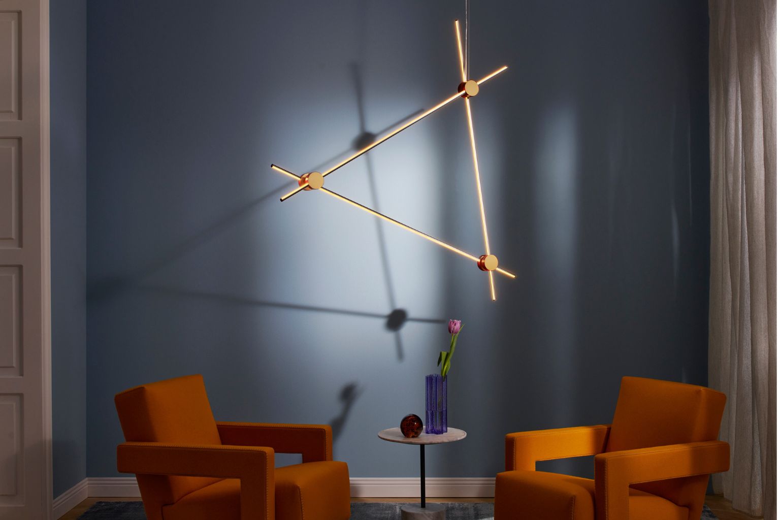 Consider a versatile lighting solution such as the EITIE Lighting System by Tobia Scarpa. This distinctive piece can transform into a wall, pendant, table or floor lamp depending on your needs. It features bars of light connected by circular black metal joints, allowing you to adjust lighting angles and effects to create your desired mood.