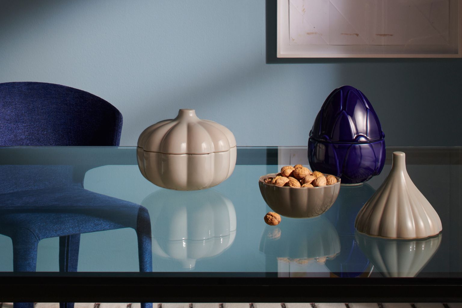 Then there are the Taac and Torrecottaaccessories designed in collaboration with renowned Italian chef Davide Oldani. Drawing inspiration from the culinary world, the Taac range features enamelled ceramic containers – shaped like a pumpkin, an onion, an asparagus and a chicken – that are both functional and decorative. These pieces offer a quirky yet elegant touch to any room, while infusing a sense of fun and creativity with their playful designs.