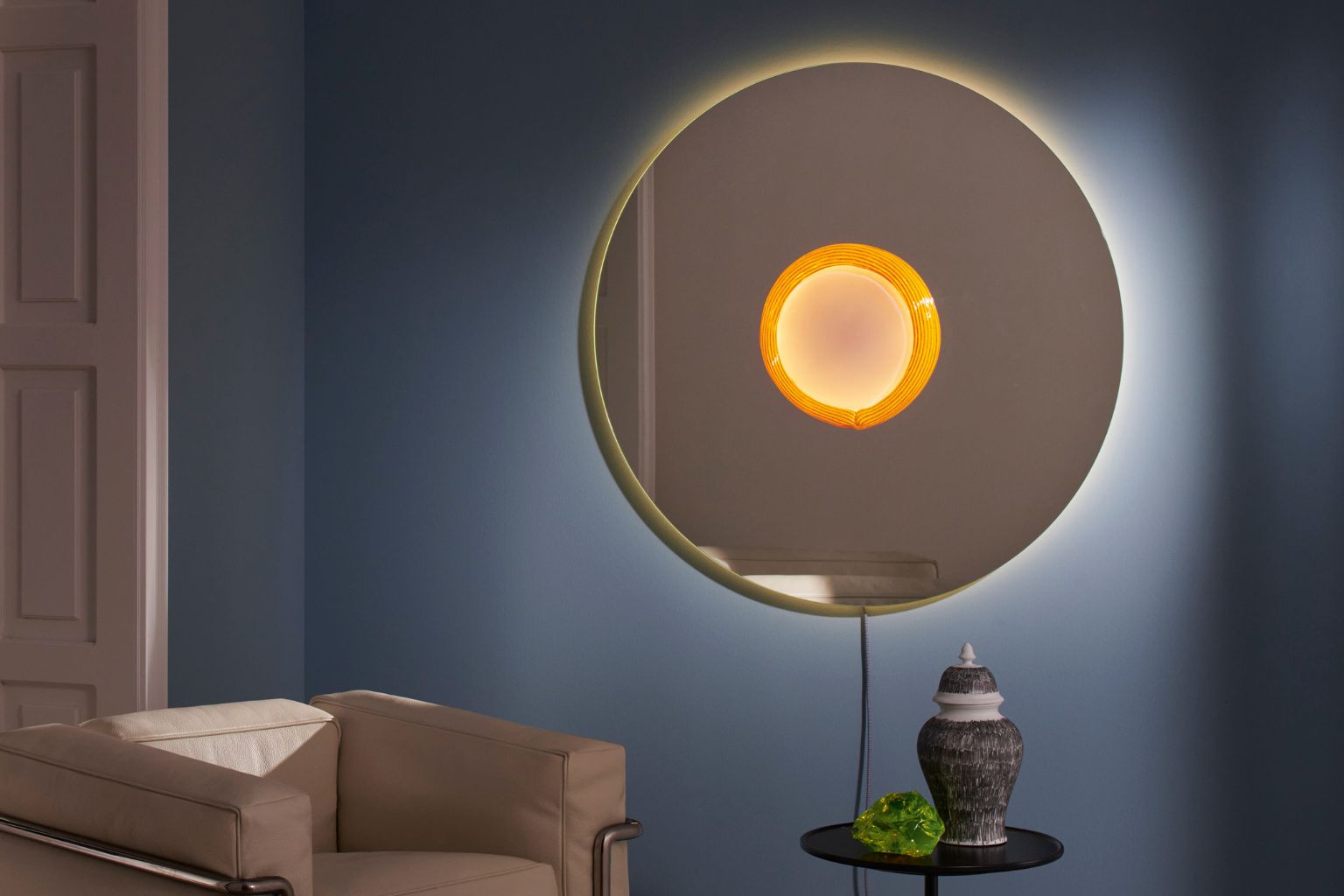 Designed as a perfect circle, the centre of the piece features a glass murrina – handcrafted by glass artisans – that can be illuminated by a sensor-activated LED light on the back.