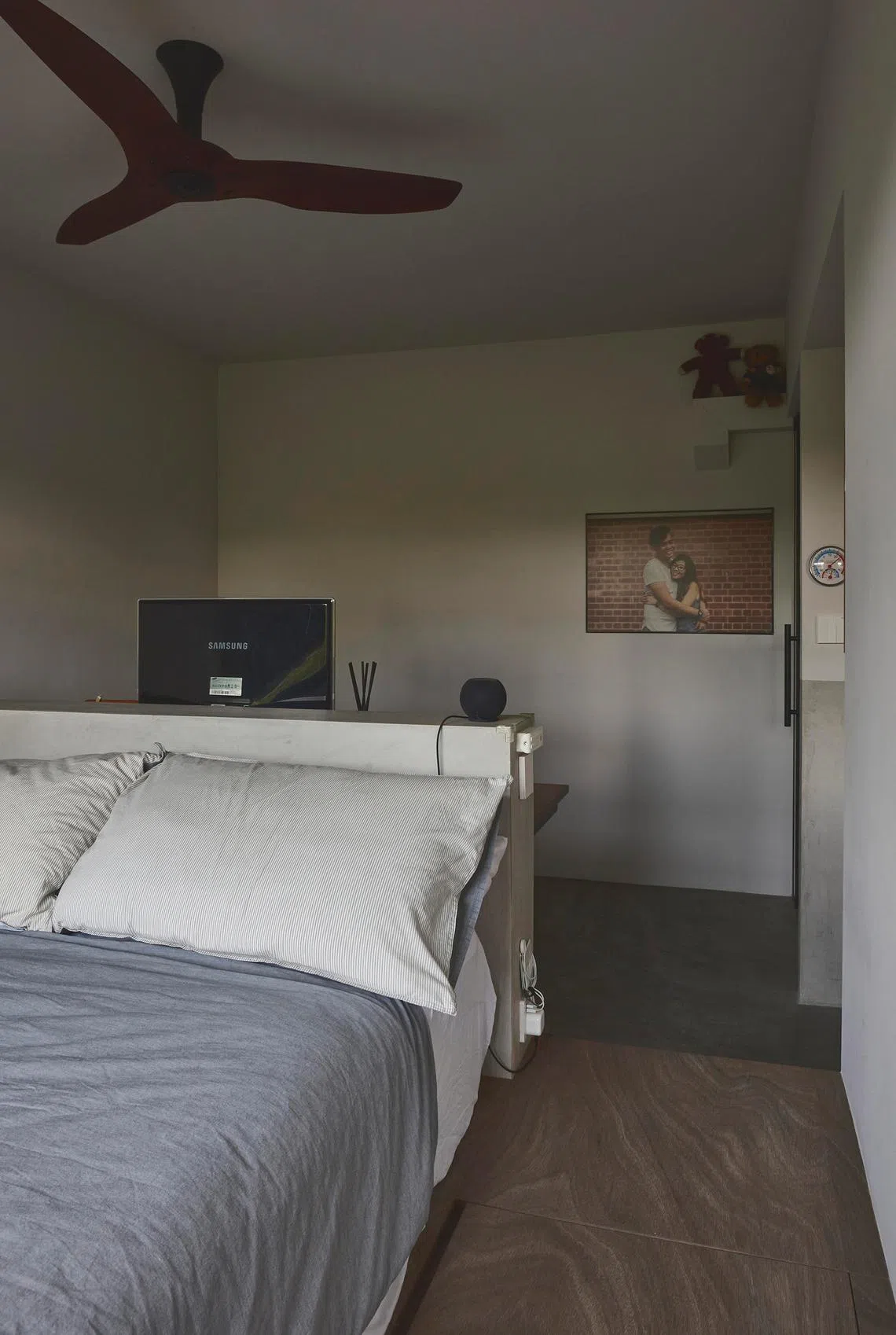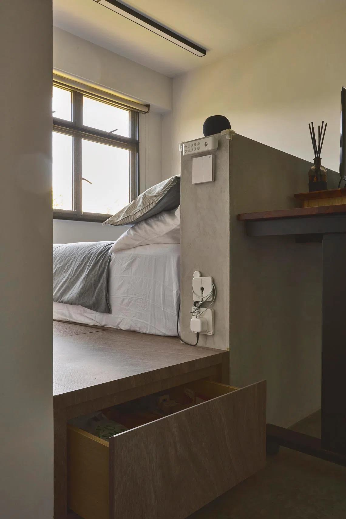 By combining the existing master bedroom with the adjacent bedroom, the couple created a spacious master suite with a bed on a storage platform. The half-height concrete bedhead also serves as a divider between the bed and the study table behind.