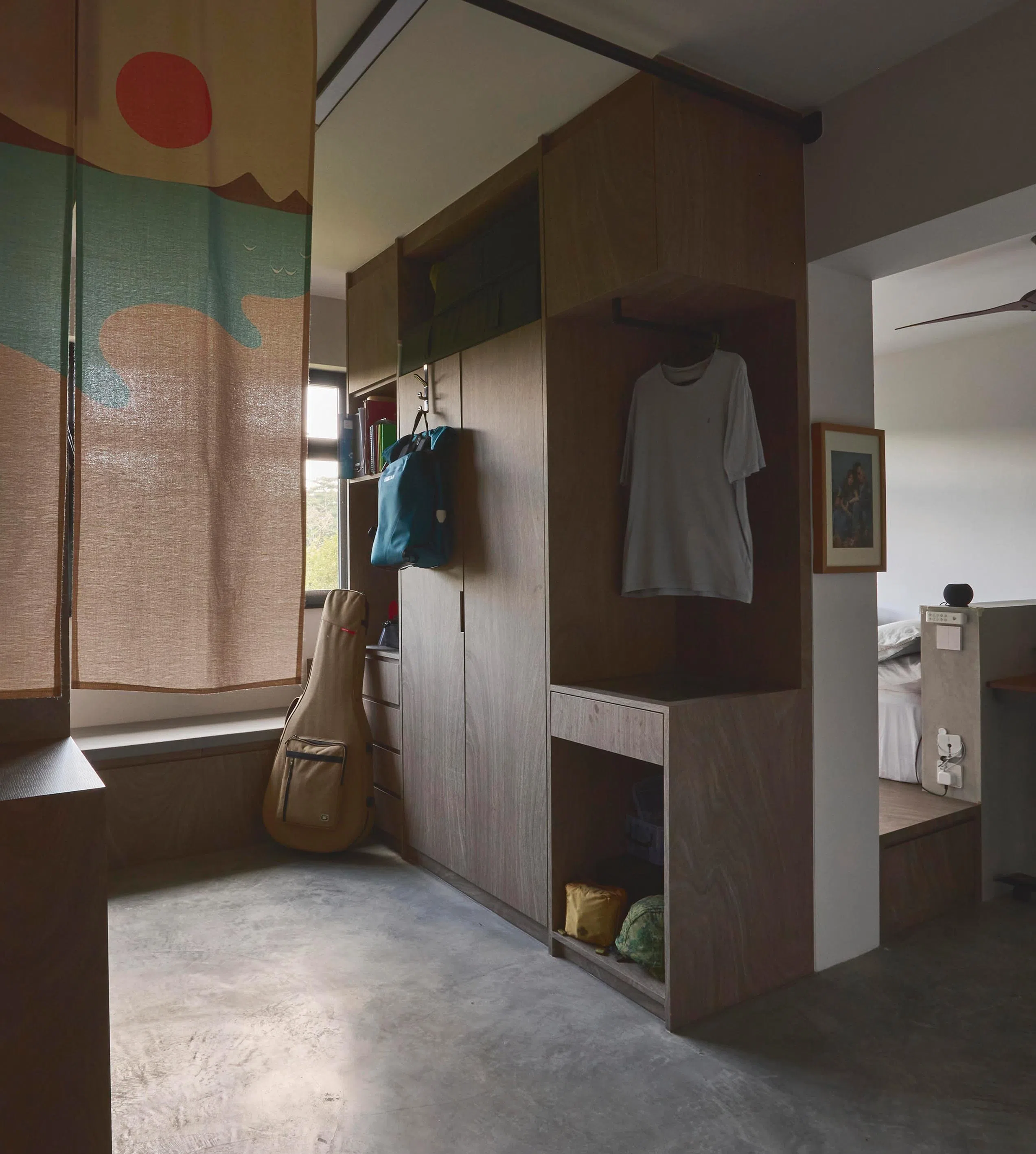 The assignment: incorporate raw, natural materials like cement and limewash, with a sense of subtle luxury; and a platform with a ramp for Mr Nah’s camera equipment, plus a dress-up area for Ms Ho.
