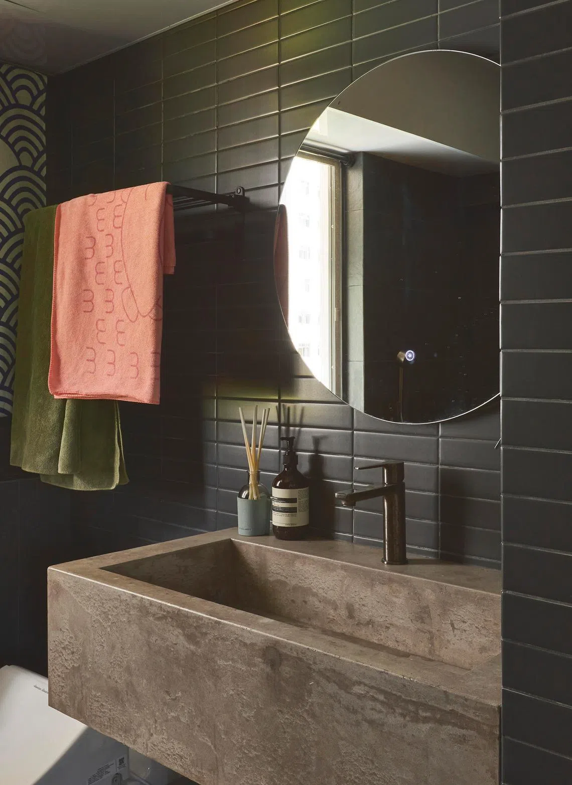 The master bathroom has large-format grey floor tiles and subway wall tiles. The centrepiece is a custom-made cast-concrete basin.