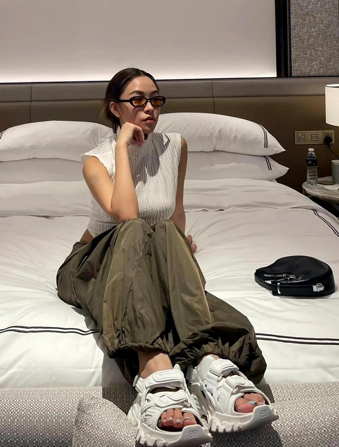 Ms Sheryl Teo in her go-to look for 2023, comprising a textured top and parachute pants, both bought in Japan, and chunky sandals by Balenciaga.