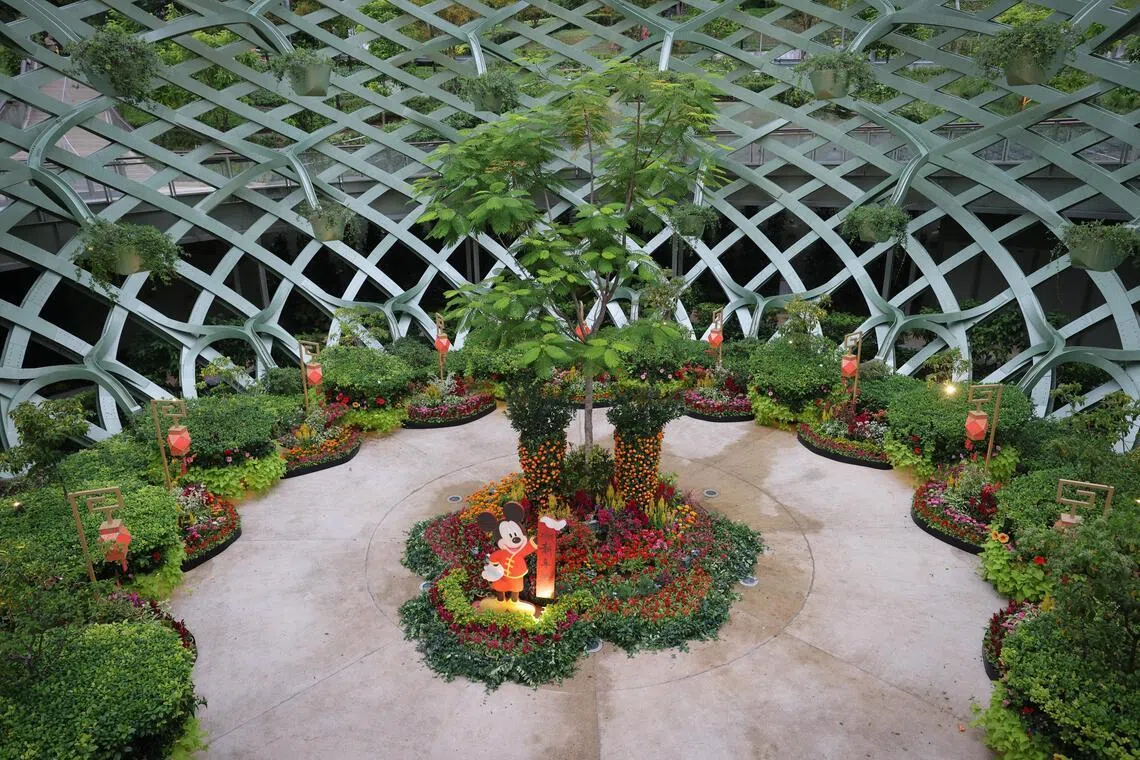 The Protector at Sentosa Sensoryscape's Tactile Trellis features the Celestial Guardian Yanyang, Disney characters and a mini-garden with festive blooms.