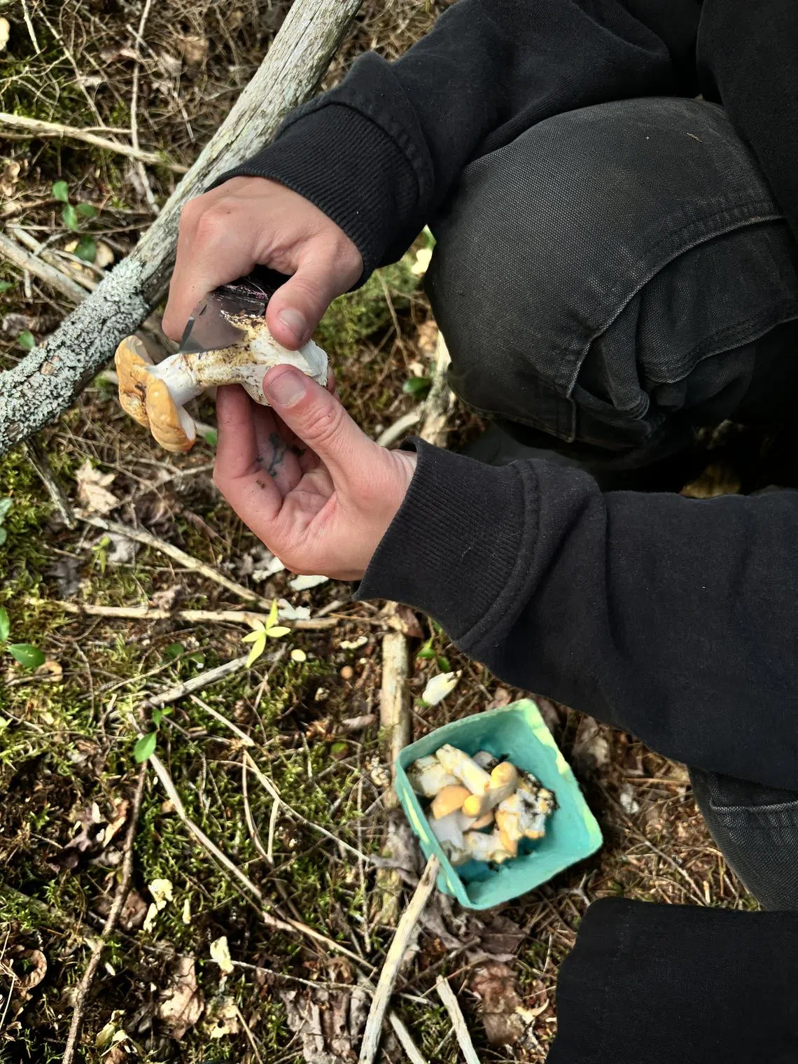 The writer and her friend foraged for hedgehog mushrooms in the woods behind the cabin.