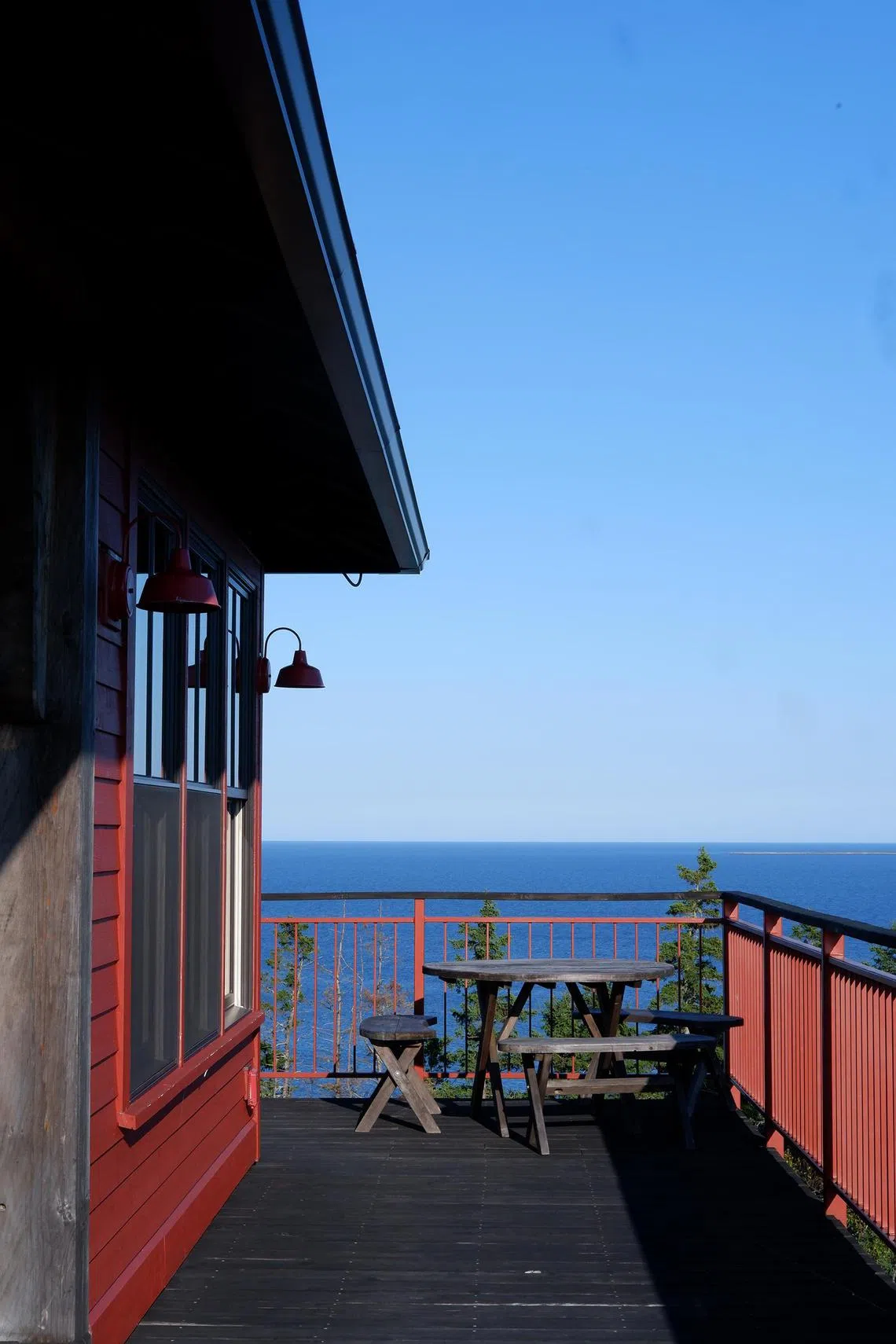 One of Bryanna’s friends, Guillaume, had worked on the cabin. He points out the structural joints in the ceilings, the nearby trees they had used. From the wraparound balcony, we see the Atlantic Ocean, stretched out like a punctuation mark at the edge of everything.