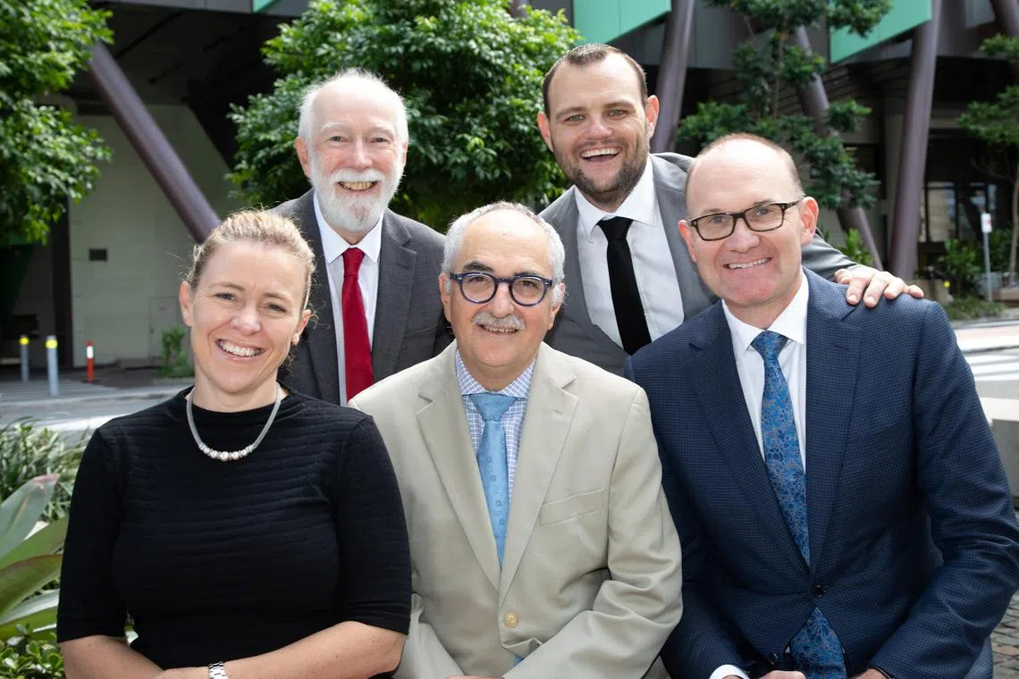 (From left) Associate Professor Paige Little, Adjunct Professor Geoff Askin and Adjunct Associate Professor Robert Labrom, with (back, from left) Emeritus Professor Mark Pearcy and Sealy R&D Manager Daniel Green. They sit on Sealy’s Orthopaedic Advisory Board, an independent body of global experts in spinal research and sleep science.