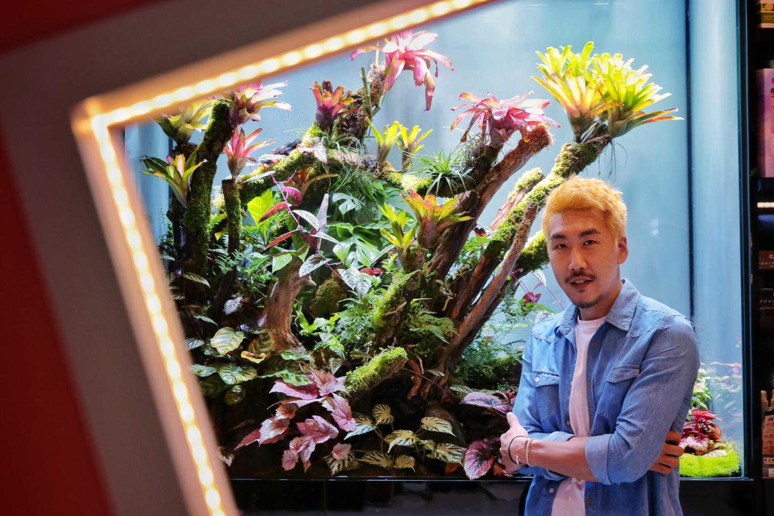 At the feature wall by the entrance of the N20 nail spa in Takashimaya, designed by Jon Wong (above) of N30 Tank, the paludarium exhibits species such as bromeliads, pipers, monsteras, begonias and ferns.
