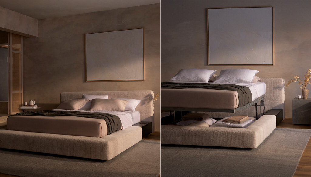 The Jasper bed's hidden storage provides extra space and elevates to a convenient height for easier sheet changes. PHOTOS: KING LIVING