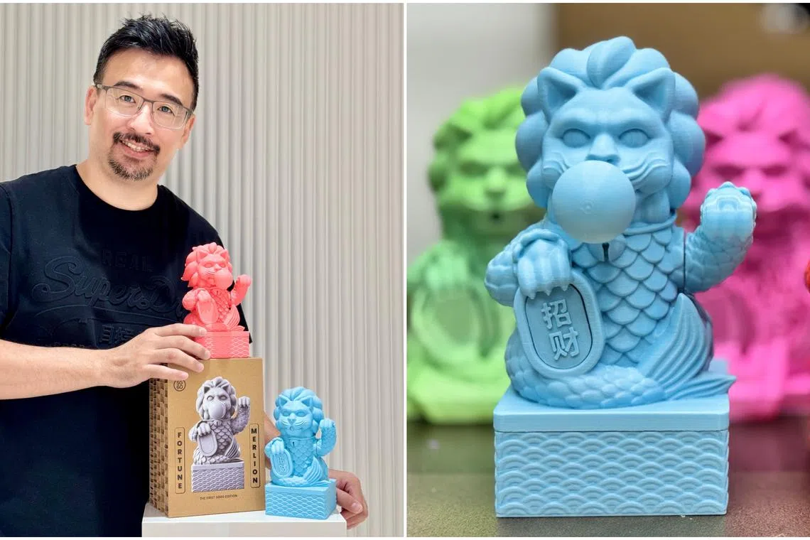 Unigons co-founder Joe Chua with some of the 3D-printed Fortune Merlions made of recycled plastic bottles.