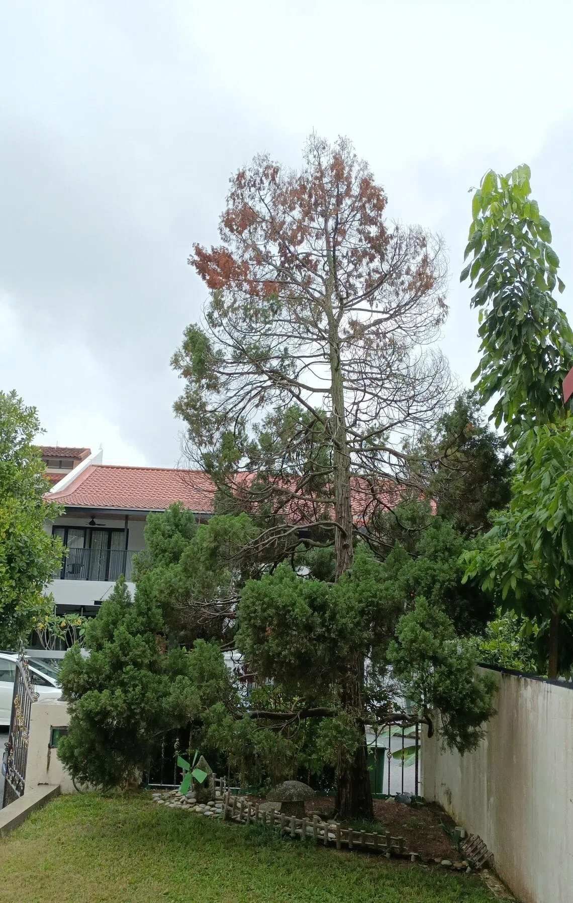I planted this tree more than 30 years ago when it was about 1.8m tall. It is now as tall as a two-storey house. About a year ago, its leaves and branches started browning from the top down. The lower leaves are still green, but some are starting to brown. How do I save my tree?