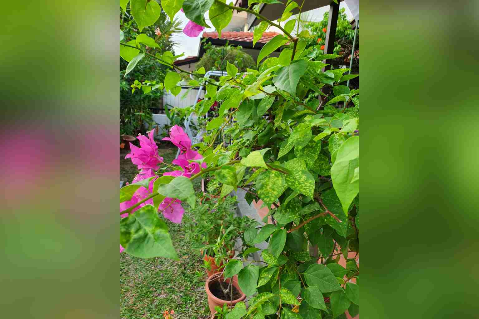 I bought this bougainvillea plant about two years ago and it had pink, yellow and white flowers. Then it stopped flowering. Now, only pink flowers are seen. How do I bring out the other colours of the blooms? Also, what caused the yellow spots on the leaves? The plant gets about six hours of afternoon sun every day.