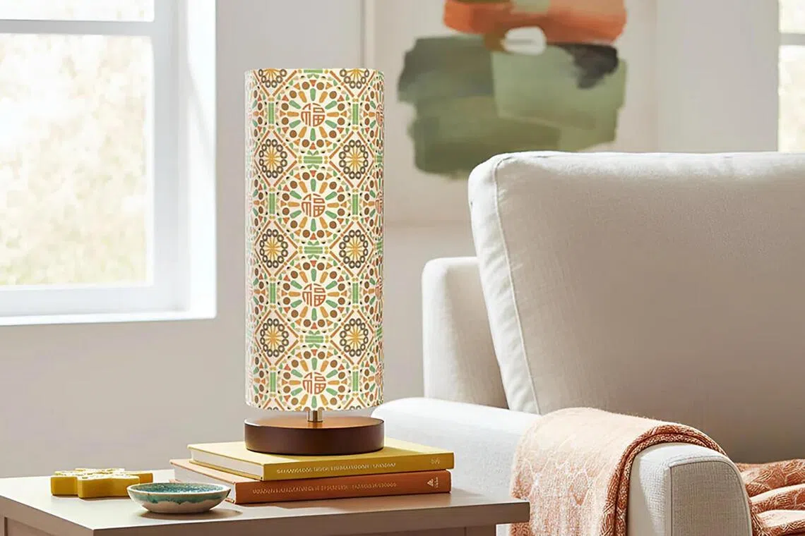 The table lamp features a pattern reminiscent of classic Peranakan tiles, and was inspired by a multicultural feast of treats from kueh tutu to pineapple tarts to ladoo.