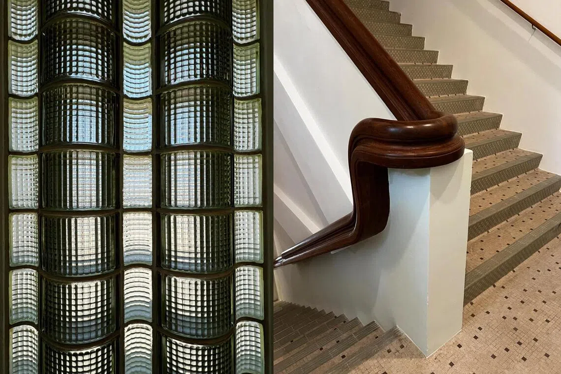 Temasek Shophouse’s architectural gems include decades-old glass blocks and original staircases with wooden bannisters and pink tiles.