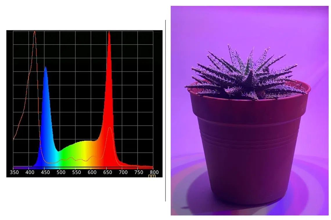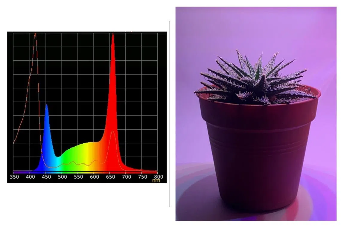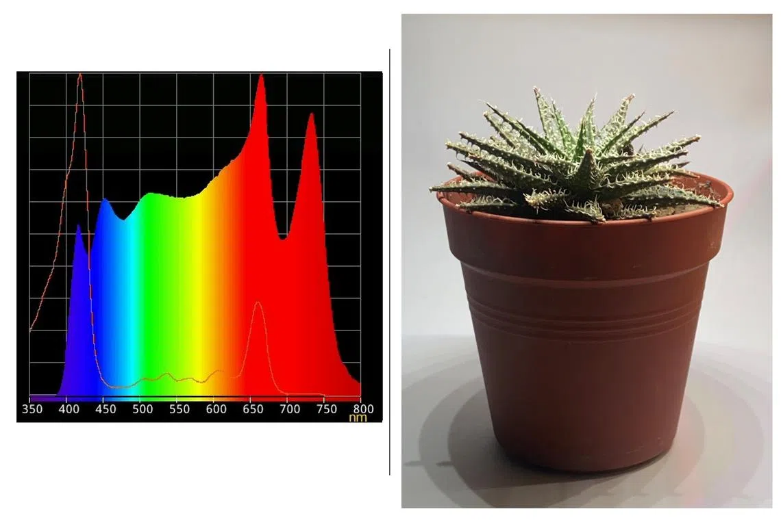 The spectrum of light emitted by a grow light is very close to that of natural sunlight. A plant placed under this grow light appears natural to the viewer.