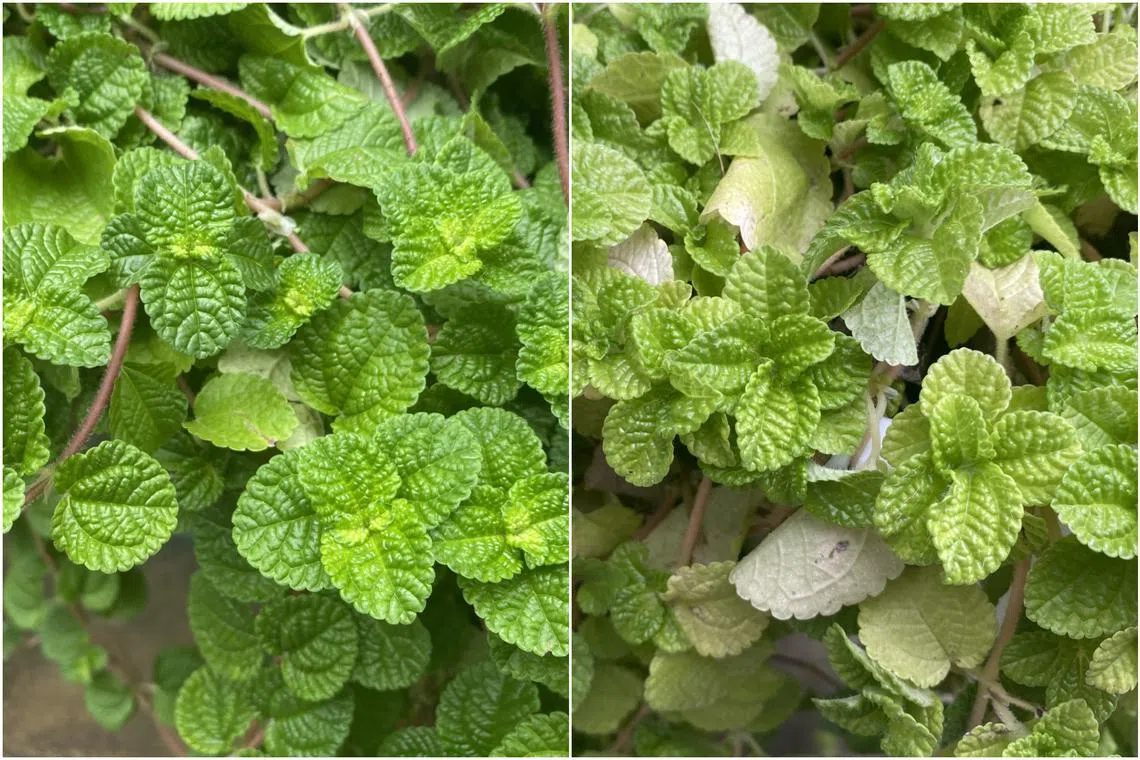 Pilea nummulariifolia thrives under filtered light, with vivid green foliage (left). Under direct sunlight, its leaves become bleached (right).