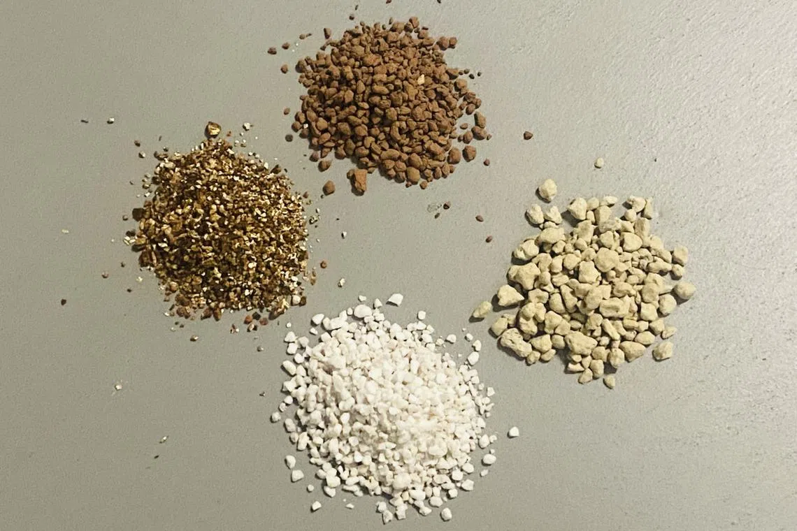 Materials such as (clockwise from left) vermiculite, fine lightweight expanded clay aggregate pellets, pumice and perlite can be added to improve drainage.