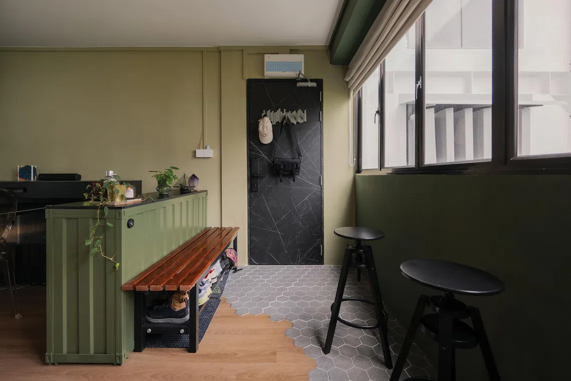 Instead of a built-in shoe cabinet, Mr Tan chose a shipping-container cabinet and bench to divide the entrance foyer and dining area.
