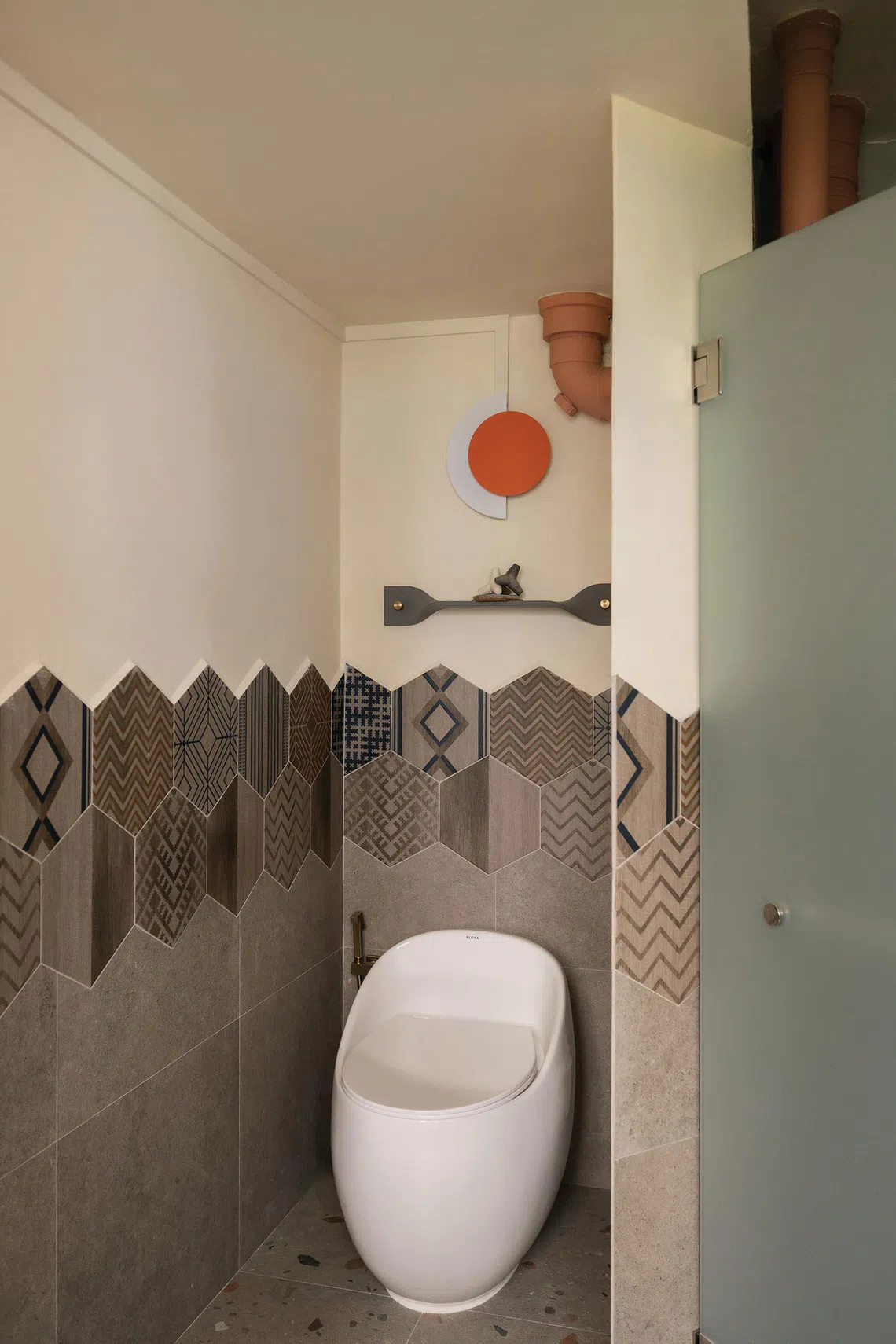 More hexagons can be found on the bathroom walls and floor. It is common for bathrooms to have a strip of accent wall tiles, but Mr Tan chose the hexagon motif to echo the shapes found elsewhere in the home and create wave-like imagery that washes across the space.