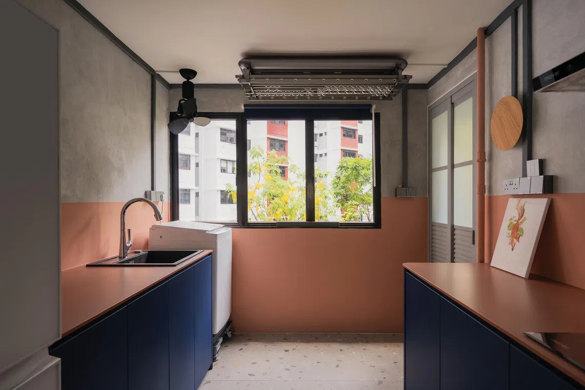 Meanwhile, in the kitchen, cinnamon red counters and blue cabinets are juxtaposed against cement screed walls and terrazzo flooring.