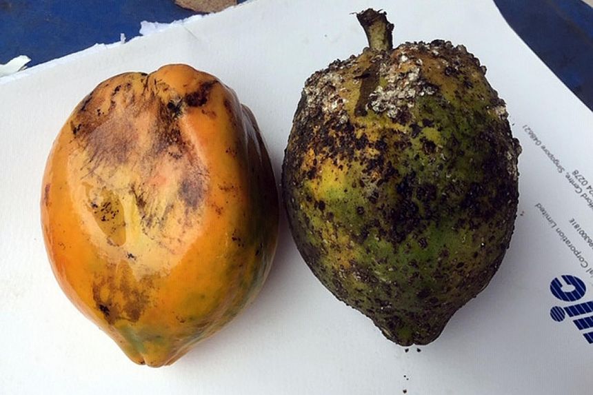 My papaya tree has recently been producing fruit that is black. There appears to be scales and fungi growing on it. However, when I wash the fruit, the skin underneath looks fine and the flesh is firm and orangey. Is the papaya edible?